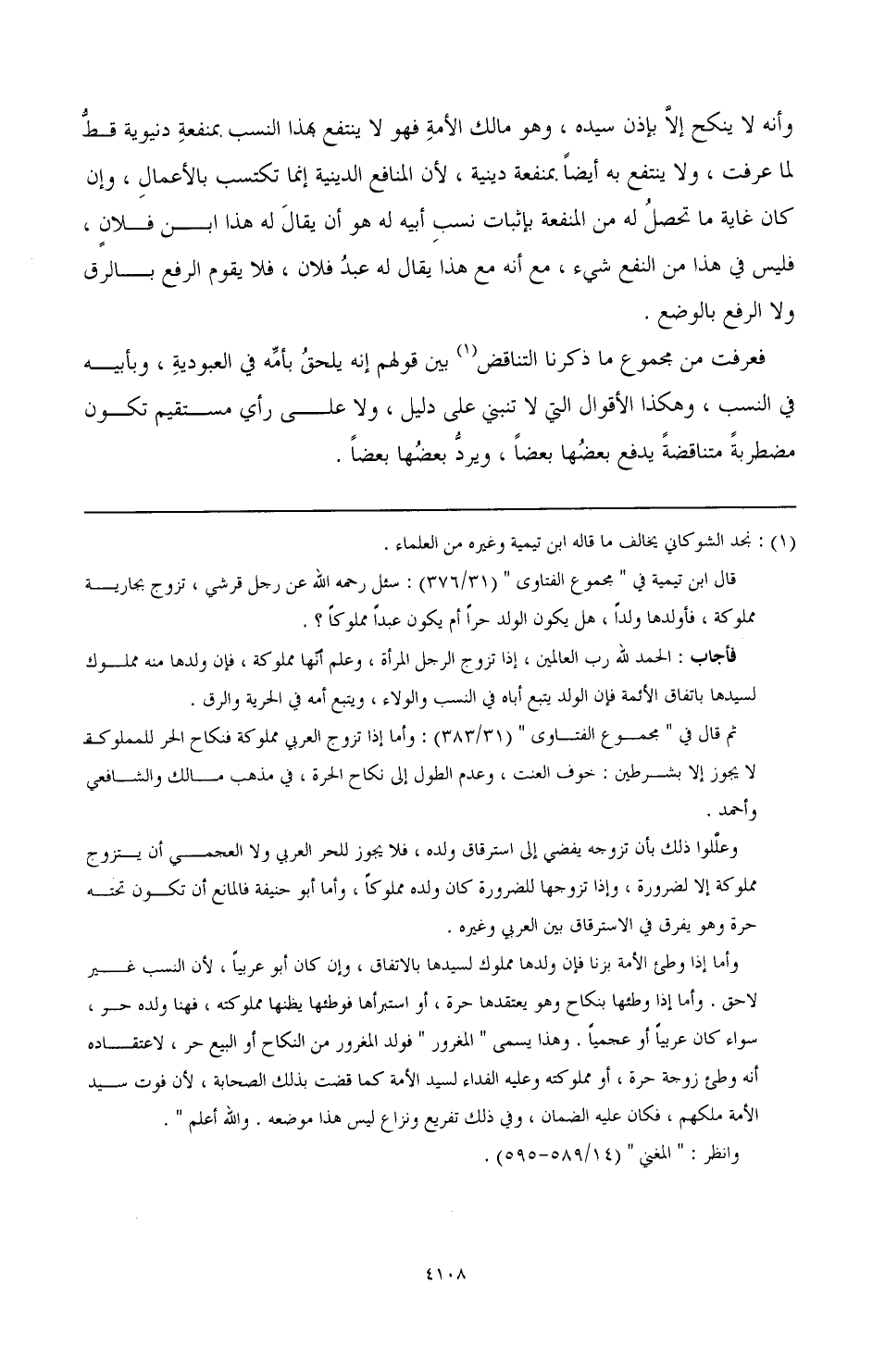 فعرفت من مجموع ما ذكرنا التنافض (¬1) بين قولهم إنه يلحقُ بأمِّه في العبودية، وبأبيه في النسب، وهكذا الأقوال التي لا تنبني على دليل، ولا على رأي مستقيم تكون مضطربةً متناقضةً يدفع بعضُها بعضًا، ويردُّ بعضُها بعضًا.