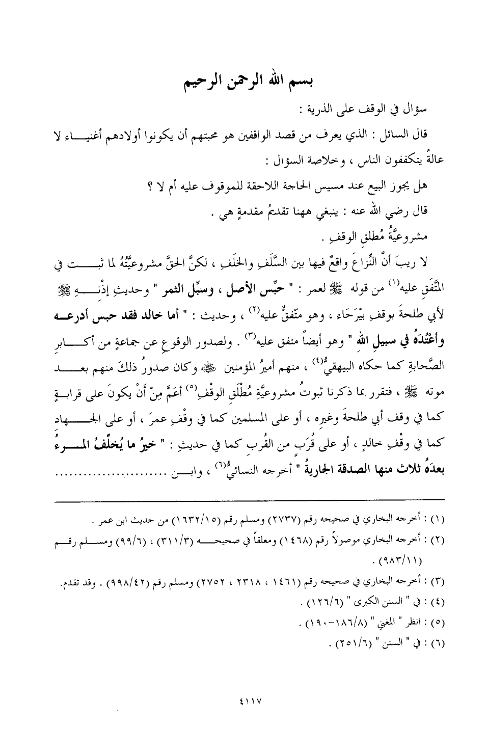 لا ريب أنَّ النزاع واقعٌ فيها بين السَّلف والخلف، لكنَّ الحقَّ مشروعيَّتُه لما ثبت في المتَّفق عليه (¬1) من قوله صَلَّى اللهُ عَلَيْهِ وَسَلَّمَ لعمر: "حبِّس الأصل، وسبِّل الثمر" وحديث إذْنِهِ صَلَّى اللهُ عَلَيْهِ وَسَلَّمَ لأبي طلحة بوقف بيْرَحاء، وهو متّفقٌ عليه (¬2)، وحديث: "أما خالد فقد حبس أدرعه وأعْتُدَهُ في سبيل الله" وهو أيضًا متفق عليه (¬3). ولصدور الوقوع عن جماعةٍ من أكابر الصحابة كما حكاه البيهقيّ (¬4)، منهم أميرُ المؤمنين رضي الله عنه وكان صدور ذلك منهم بعد موته صَلَّى اللهُ عَلَيْهِ وَسَلَّمَ، فتقرر بما ذكرنا ثبوت مشروعية مُطْلق الوقف (¬5) أعَمَّ مِنْ أنْ يكون على قرابة كما في وقف أبي طلحة وغيره، أو على المسلمين كما في وقف عمر، أو على الجهاد كما في وقف خالد، أو على قُرَبٍ من القُرب كما في حديث: "خيرُ ما يُخلِّفُ المرءُ بعدَهُ ثلاث منه الصدقة الجارية" أخرجه النسائيُّ (¬6)، وابن ..............................
