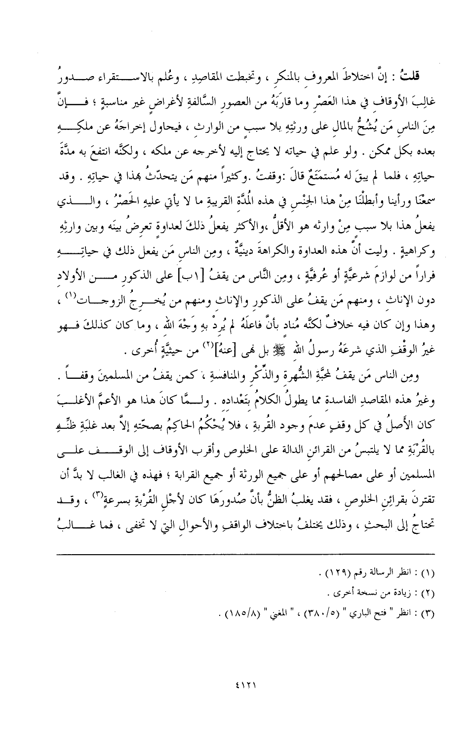 قلتُ: إنّ اختلاط المعروف بالمنكر، وتخبطت المقاصِدِ، وعُلم بالاستقراء صدورُ غالِبَ الأوقاف في هذا العَصْر وما قاربه من العصور السَّالفة لأغراض غير مناسبة؛ فإنَّ من الناس من يُشُحُّ بالمال على ورثته بلا سبب من الوارث، فيحاول إخراجَهُ عن ملكه بعده بكل ممكن. ولو علم في حياته لا يحتاج إليه لأخرجه عن ملكه، ولكنَّه انتفع به مدَّةَ حياتِه، فلما لم يبق له مُستمتَعٌ قال: وقفتُ. وكثيرًا منهم مَن يتحدّثُ بهذا في حياتِهِ. وقد سمعْنا ورأينا وأبطللْنا من هذا الجنس في هذه المُدَّة القريبة ما لا يأتي عليه الحصرُ، والذي يفعل هذا بلا سبب مِنْ وارثه هو الأقلُّ، والأكثر يفعلُ ذلك لعداوةٍ تعرض بينه وبين وارثه وكراهيةٍ. وليت أنّ هذه العداوة والكراهة دينيَّةٌ، ومِن الناس مَن يفعل ذلك في حياتِه فرارًا من لوازمَ شرعيَّةٍ أو عُرفيَّةٍ، ومِن النَّاس من يقفُ [1ب] على الذكور من الأولاد دون الإناث، ومنهم من يقفُ على الذكور والإناث ومنهم من يُخرِجُ الزوجات (¬1)، وهذا وإن كان فيه خلافٌ لكنَّه مُنادٍ بأنَّ فاعلَهُ لم يُرِدْ بهِ وَجْه الله، وما كان كذلك فهو غيرُ الوقف الذي شرعه رسول الله صَلَّى اللهُ عَلَيْهِ وَسَلَّمَ بل نهى [عنه] (¬2) من حيثيَّة أُخرى.