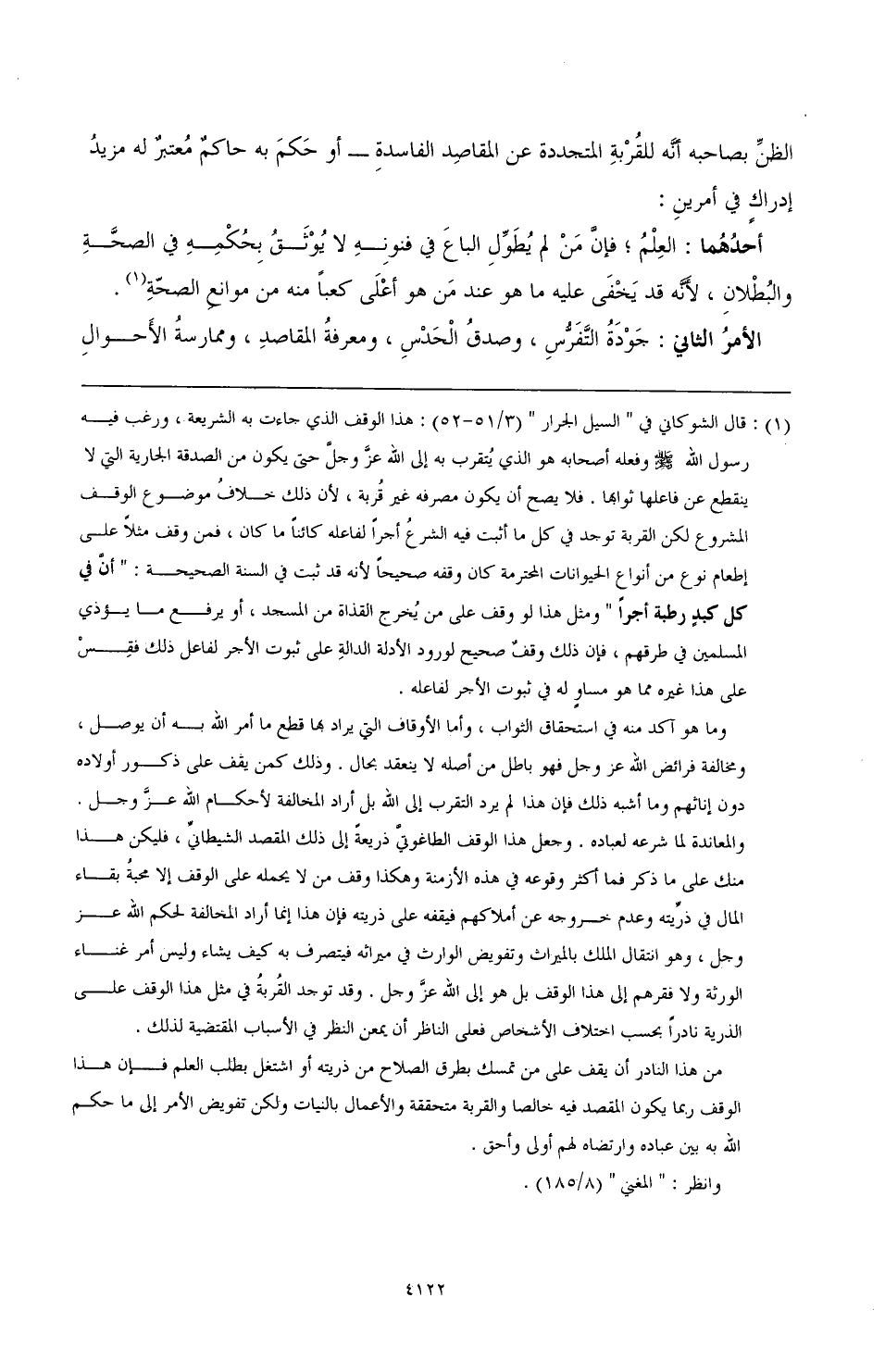 (¬1) قال الشوكاني في "السيل الجرار" (3/ 51 - 52): هذا الوقف الذي جاءت به الشريعة، ورغب فيه رسول الله صَلَّى اللهُ عَلَيْهِ وَسَلَّمَ وفعله أصحابه هو الذي يُتقرب به إلى الله عزَّ وجلّ حتى يكون من الصدقة الجارية التي لا ينقطع عن فاعلها ثوابه. فلا يصح أن يكون مصرفه غير قُربة، لأن ذلك خلافُ موضوع الوقف المشروع لكن القرية توجد في كل ما أثبت فيه الشرعُ أجرًا لفاعله كائنًا ما كان، فمن وقف مثلاً على إطعام نوع من أنواع الحيوانات المحترمة كان وقفه صحيحًا لأنه قد ثبت في السنة الصحيحة: "أنّ في كل كبدٍ رطبة أجرًا" ومثل هذا لو وقف على من يُخرج القذاة من المسجد، أو يرفع ما يؤذي المسلمين في طرقهم، فإن ذلك وقفٌ صحيح لورود الأدلة الدالةِ على ثبوت الأجر لفاعل ذلك فقِسْ على هذا غيره مما هو مساوٍ له في ثبوت الأجر لفاعله.
