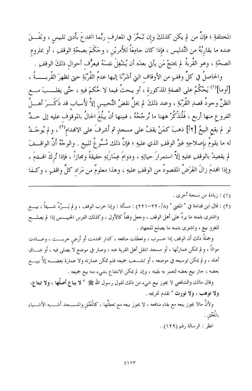 (¬2) قال ابن قدامة في "المغني" (8/ 220 - 221): مسألة: وإذا خرب الوقف، ولم يَرُدّ شيئًا، بيع واشترى بثمنه ما يردّ على أهل الوقف، وجعل وقفًا كالأول، وكذلك الفرس الحبيس إذا لم يصلح للغزو بيع، واشترى بثمنه ما يصلح للجهاد.