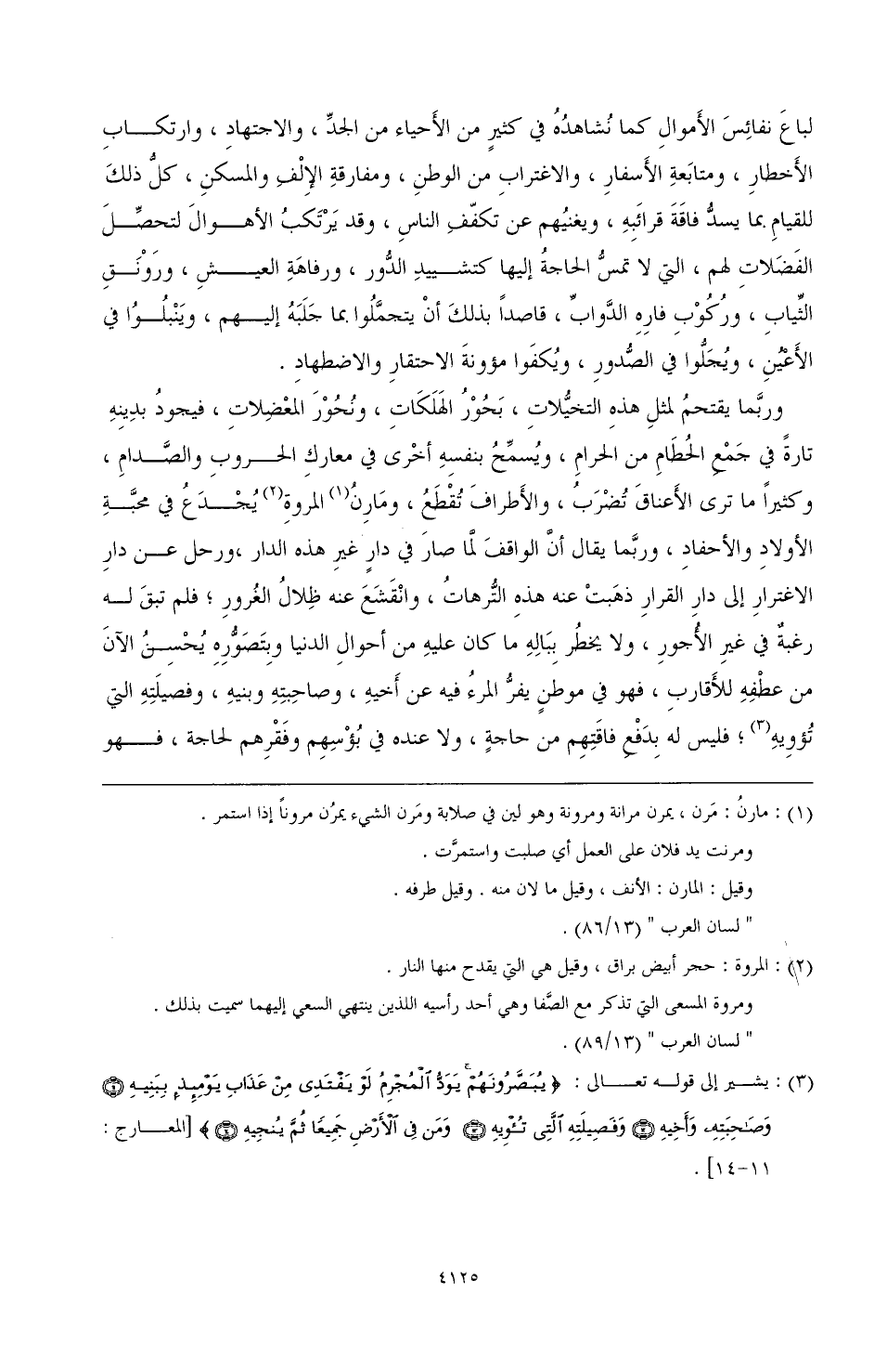 لباعَ نفائس الأموال كما نُشاهده في كثير من الأحياء من الجدِّ، والاجتهاد، وارتكاب الأخطار، ومتابعة الأسفار، والاغتراب من الوطن، ومفارقة الإلف والمسكن، كلُّ ذلك للقيام بما يسدُّ فاقة قرائبه، ويغنيهم عن تكفّف الناس، وقد يرْتَكبُ الأهوال لتحصِّل الفضلات لهم، التي لا تمسُّ الحاجة إليها كتشييد الدُّور، ورفاهة العيش، ورونق الثياب، وركوب فاره الدَّواب، قاصدًا بذلك أن يتجمَّلوا بما جلبه إليهم، وينبلُوا في الأَعيُن، ويُجلُّوا في الصدرو، ويكفوا مؤونة الاحتقار والاضطهاد.