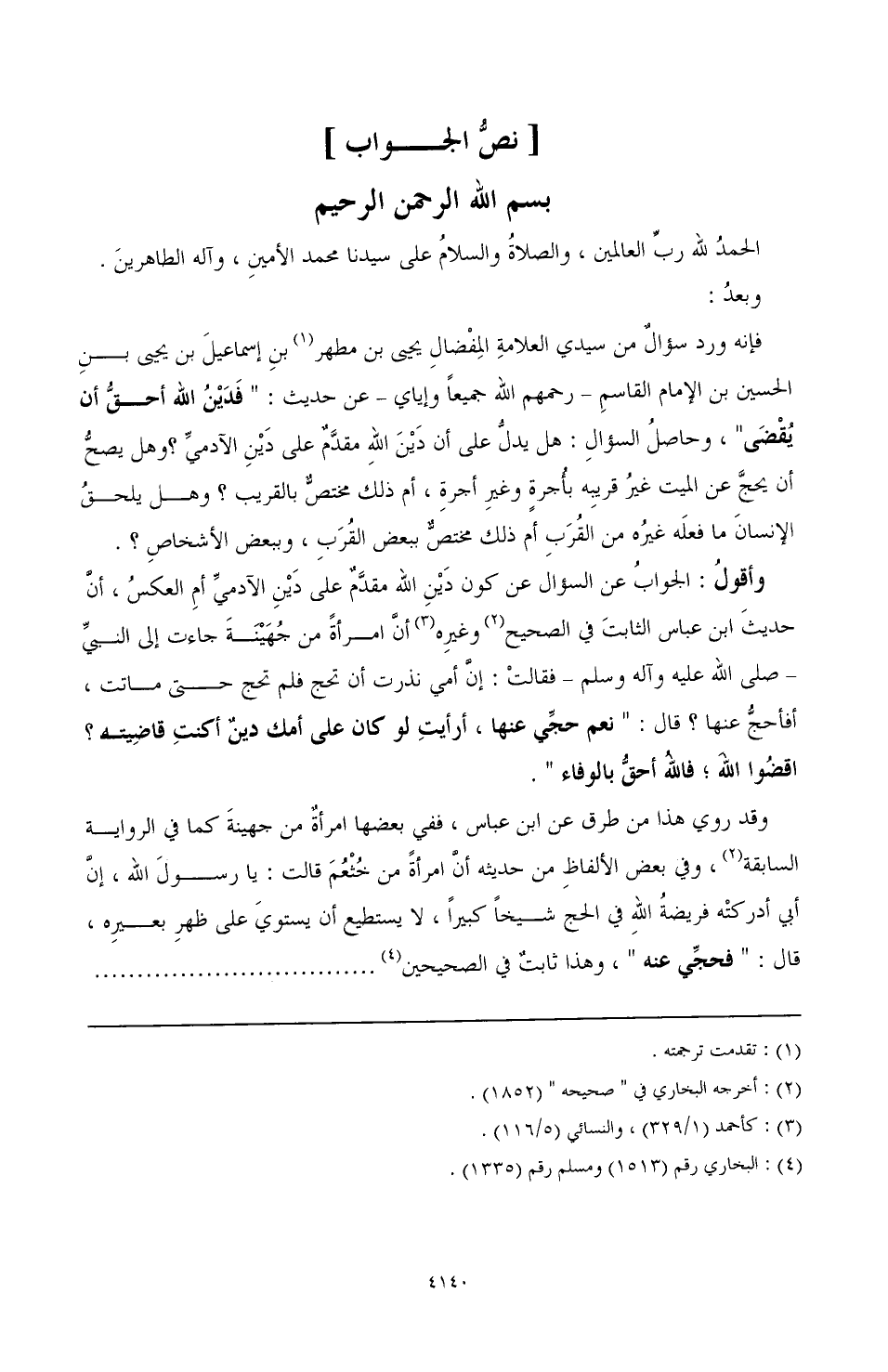 وأقولُ: الجوابُ عن السؤال عن كون دَيْنِ الله مقدَّمٌ على دَيْن الآدميّ أم العكسُ، أنّ حديث ابن عباس الثابتَ في الصحيح (¬2) وغيرِه (¬3) أنّ امرأةً من جُهَيْنَةَ جاءت إلى النبي ـ صَلَّى اللهُ عَلَيْهِ وَآلِهِ وَسَلَّمَ ـ فقالتْ: إنّ أمي نذرت أن تحج فلم تحج حتى ماتت، أفأحجُّ عنها؟ قال: "نعم حجِّي عنها، أرأيتِ لو كان على أمك دينٌ أكنتِ قاضِيته؟ اقضوا الله؛ فالله أحقُّ الوفاء".