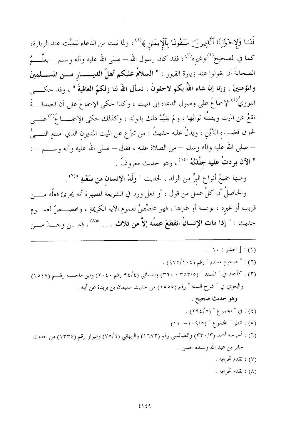 لَنَا وَلِإِخْوَانِنَا الَّذِينَ سَبَقُونَا بِالْإِيمَانِ {(¬1)، ولما ثبت من الدعاء للميِّت عند الزيارة، كما في الصحيح (¬2) وغيرِه (¬3)، فقد كان رسول الله ـ صَلَّى اللهُ عَلَيْهِ وَآلِهِ وَسَلَّمَ ـ يعلِّمُ الصحابَة أن يقولوا عند زيادة القبور: "السلام عليكم أهل الديار من المسلمين والمؤمنين، وإنا إن شاء الله بكم لاحقون، نسأل الله لنا ولكمُ العافية"، وقد حكى النوويُّ (¬4) الإجماع على وصول الدعاء إلى الميت، وكذا حكى الإجماع على أن الصدقة تقعُ عن الميت ويصلُه ثوابُها، ولم يقيِّد ذلك بالولد، وكذلك حكى الإجماعَ (¬5) على لحوق قضاء الدَّيْنِ، ويدلُّ عليه حديثُ: من تبرَّع عن الميت المديونِ الذي امتنع النبيُّ ـ صَلَّى اللهُ عَلَيْهِ وَآلِهِ وَسَلَّمَ ـ من الصلاة عليه، فقال ـ صَلَّى اللهُ عَلَيْهِ وَآلِهِ وَسَلَّمَ ـ: "الآن بردتْ عليه جِلْدَتُهُ" (¬6)، وهو حديث معروفٌ.
