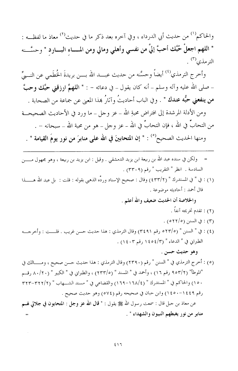 قال: فانتظرته حتى قضى صلاته، ثم جئته من قبل وجهه، فسلمت عليه، ثم قلت: والله إني أحبك لله، فقال: ألله؟ فقلت: ألله؟ فقال: ألله؟ فقلت: ألله؟ فقال: ألله؟ فقلت: ألله، قال: فأحذ بحبوة ردائي، فجذبني إليه وقال: أبشر فإني سمعت رسول الله صَلَّى اللهُ عَلَيْهِ وَسَلَّمَ يقول: " قال الله تبارك وتعالى: وجبت محبتي للمتحابين في، والمتجالسين في، والمتزاورين في، والمتباذلين في " وهو حديث صحيح.