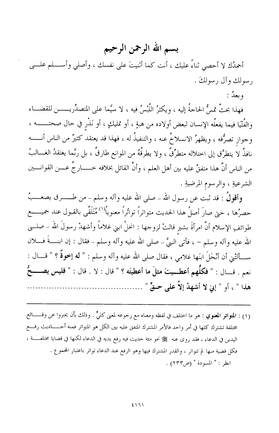 وأقولُ: قد ثبت عن رسول الله ـ صَلَّى اللهُ عَلَيْهِ وَآلِهِ وَسَلَّمَ ـ من طرق يصعبُ حصرُها، حتى صارَ أصلُ هذا الحديث متواترًا تواتُرًا معنويًّا (¬1) مُتَلَقَّى بالقبول عند جميع طوائف الإسلام أنَّ امرأة بشيرٍ قالتْ لزوجها: انحلْ ابني غلامًا وأشهدْ رسول الله ـ صَلَّى اللهُ عَلَيْهِ وَآلِهِ وَسَلَّمَ ـ، فأتى النبيَّ ـ صَلَّى اللهُ عَلَيْهِ وَآلِهِ وَسَلَّمَ ـ فقال: إن ابنةَ فلان سألتني أن أنْحَلَ ابنَها غلامي، فقال صَلَّى اللهُ عَلَيْهِ وَآلِهِ وَسَلَّمَ: "له إخوةٌ؟ " قال: نعم. قال: "فكلُّهم أعطيت مثلَ ما أعطيتَه؟ " قال: لا. قال: "فليس يصحُّ هذا"، أو "إني لا أشهدُ إلاَّ على حقّ" ............................
