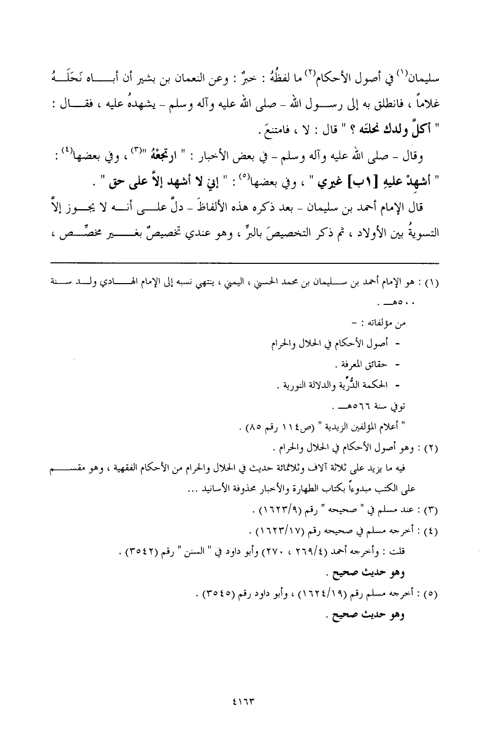 سليمان (¬1) في أصول الأحكام (¬2) ما لفظُهُ: خبرٌ: وعن النعمان بن بشير أن أباه نَحَلَهُ غلامًا، فانطلق به إلى رسول الله ـ صَلَّى اللهُ عَلَيْهِ وَآلِهِ وَسَلَّمَ ـ، فقال: "أكلَّ ولدك نحلتَه؟ " قال: لا، فامتنع.