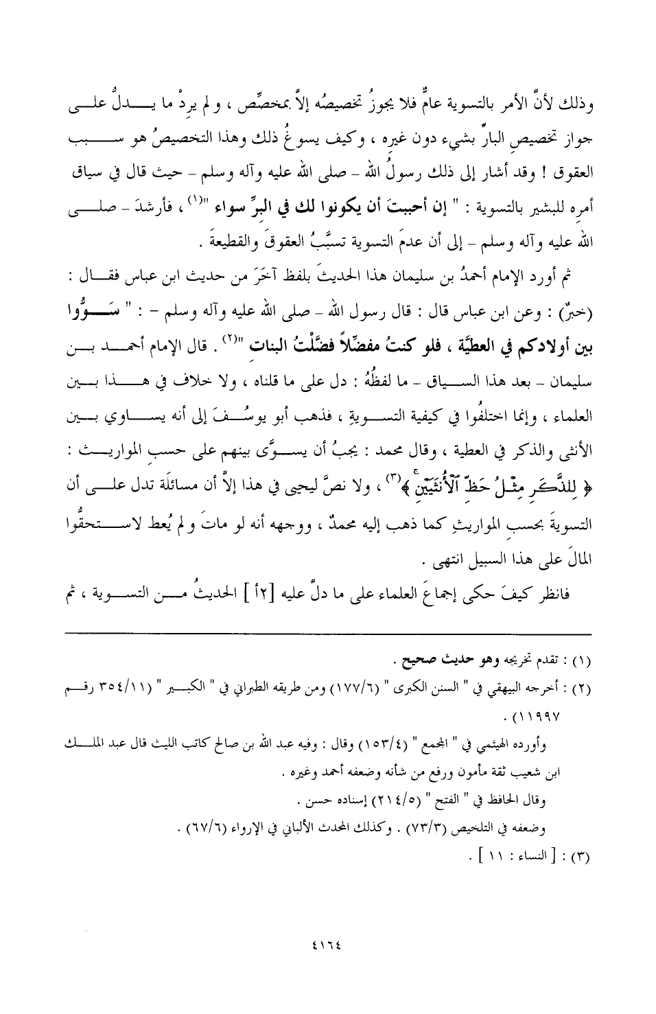 ثم أورد الإمام أحمدُ بن سليمان هذا الحديثَ بلفظ آخَرَ من حديث ابن عباس فقال: (خبرٌ): وعن ابن عباس قال: قال رسول الله ـ صَلَّى اللهُ عَلَيْهِ وَآلِهِ وَسَلَّمَ ـ: "سَوُّوا بين أولادكم في العطيَّة، فلو كنتُ مفضِّلاً فضَّلْتُ البناتِ" (¬2). قال الإمام أحمد بن سليمان ـ بعدهذا السياق ـ ما لفظُهُ: دل على ما قلناه، ولا خلاف في هذا بين العلماء، وإنما اختلفُوا في كيفية التسوية، فذهب أبو يوسُفَ إلى أنه يساوي بين الأنثى والذكر في العطية، وقال محمد: يجب أن يسوَّى بينهم على حسبِ المواريث: {لِلذَّكَرِ مِثْلُ حَظِّ الْأُنْثَيَيْنِ} (¬3)، ولا نصَّ ليحيى في هذ الاَّ أن مسائلَة تدل على أن التسوية بحسب المواريث ما ذهب إليه محمدٌ، ووجهه أنه لو ماتَ ولم يُعط لاستحقُّوا المالَ على هذا السبيل انتهى.