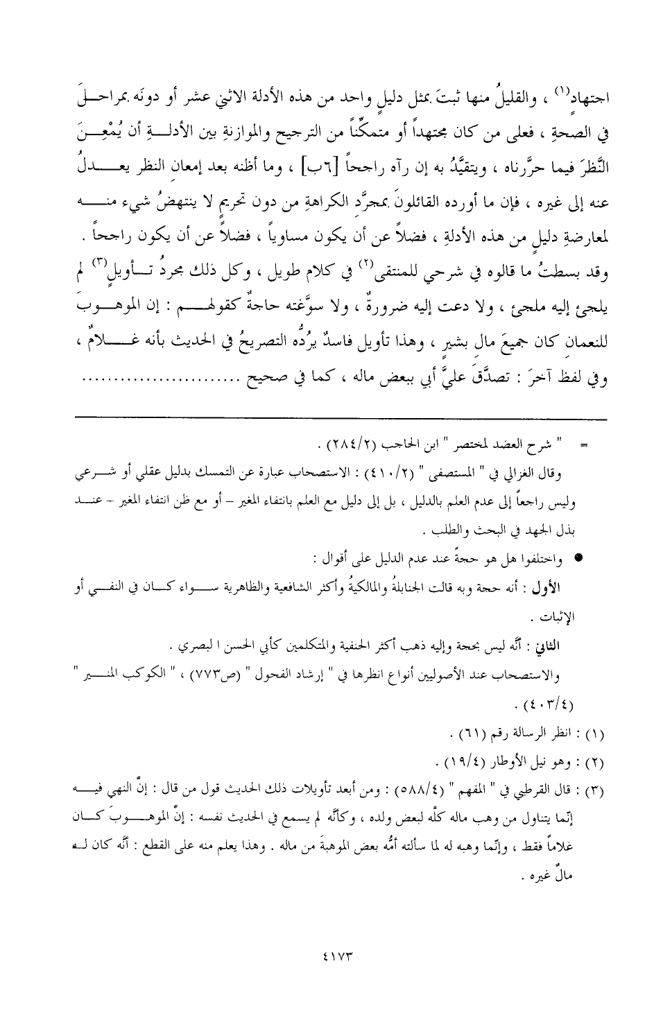 اجتهاد (¬1)، والقليلُ منها ثبتَ بمثل دليلٍ واحد من هذه الأدلة الاثنى عشر أو دونَه بمراحل في الصحة، فعلى من كان مجتهدًا أو متمكنًا من الترجيح والموازنة بين الأدلة أن يُمْعِنَ النَّظر فيما حرَّرناه، ويتقيَّدُ به إن رآه راجحًا [6ب]، وما أظنه بعد إمعان النظر يعدلُ عنه إلى غيره، فإن ما أورده القائلون بمجرد الكراهة من دون تحريم لا ينتهض شيء منه لمعارضة دليل من هذه الأدلة، فضلاً عن أن يكون مساويًا، فضلاً عن أن يكون راجحًا. وقد بسطتُ ما قالوه في شرحي للمنتقى (¬2) في كلام طويل، وكل ذلك مجردُ تأويلٍ (¬3) لم يلجئ إليه ملجئ، ولا دعت إليه ضرورةٌ، ولا سوَّغته حاجةٌ كقولهم: إن الموهوبَ للنعمان كان جميعَ مالِ بشير، وهذا تأويل فاسدٌ يرُدُّه التصريحُ في الحديث بأنه غلامٌ، وفي لفظ آخر: تصدَّقَ عليَّ أبي ببعض ماله، كما في صحيح .......................................