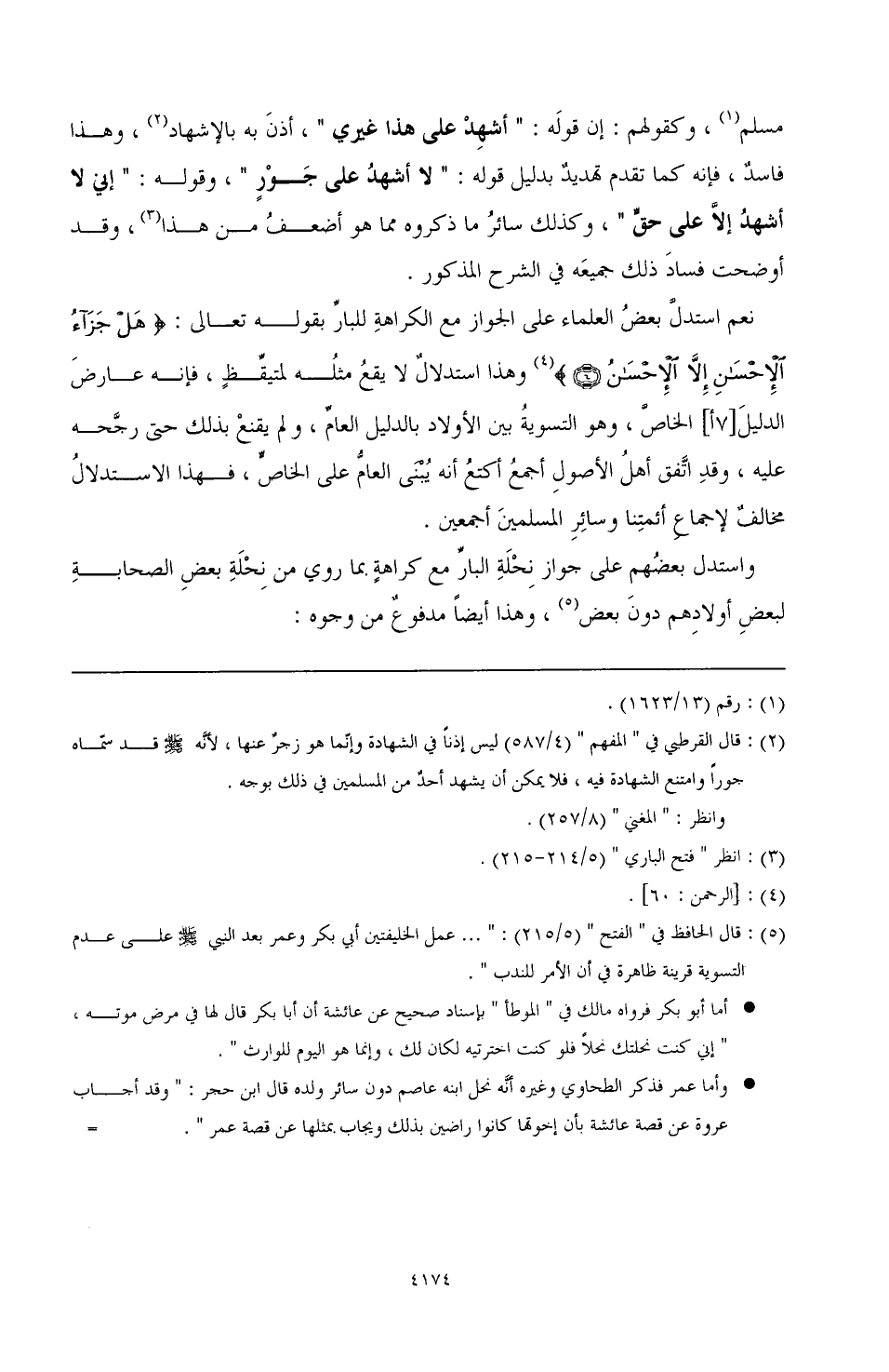 مسلم (¬1)، وكقولهم: إن قولَه: "أشهِدْ على هذا غيري"، أذنَ به بالإشهاد (¬2)، وهذا فاسدٌ، فإنه كما تقدم تهديدٌ بدليل قوله: "لا أشهدُ على جَوْرٍ"، وقوله: "إني لا أشهدُ إلاَّ على حقّ"، وكذلك سائر ما ذكروه مما هو أضعفُ من هذا (¬3)، وقد أوضحت فسادَ ذلك جميعَه في الشرح المذكور.