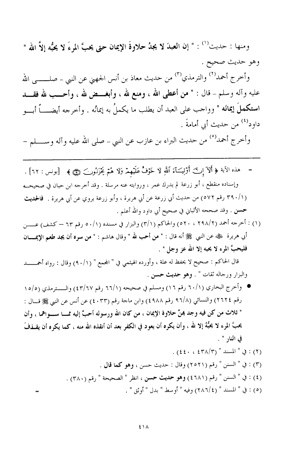 وأخرج البخاري (1/ 60 رقم 16) ومسلم في صحيحه (1/ 66 رقم 67/ 43) والترمذي (5/ 15 رقم 2624) والنسائي (8/ 96 رقم 4988) وابن ماجه رقم (4033) عن أنس عن النبي صَلَّى اللهُ عَلَيْهِ وَسَلَّمَ قال: "ثلاث من كن فيه وجد بهن حلاوة الإيمان، من كان الله ورسوله أحب إليه مما سواهما، وأن يحب المرء لا يحبه إلا لله، وأن يكره أن يعود في الكفر بعد أن أنقذه الله منه، كما يكره أن يقذف في النار".