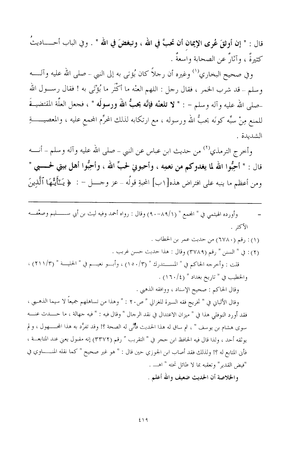 قال: " إن أوثق عرى الإيمان أن تحب في الله، وتبغض في الله ". وفي الباب أحاديث كثيرة، وآثار عن الصحابة واسعة.