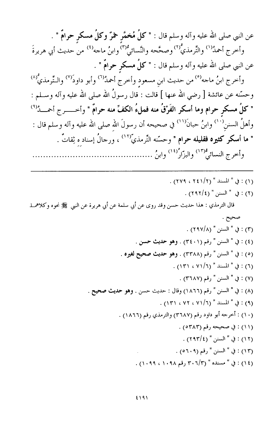 وأخرج ابن ماجه (¬5) من حديث ابن مسعود وأخرج أحمد (¬6) وأبو داود (¬7) والترمذي (¬8) وحسّنه عن عائشة [رضي الله عنها] قالت: قال رسول الله صَلَّى اللهُ عَلَيْهِ وَآلِهِ وَسَلَّمَ: "كل مسكرٍ حرام وما أسكر الفَرْقُ منه فملءُ الكفِّ منه حرامٌ" وأخرج أحمد (¬9) وأهل السنن (¬10) وابن حبان (¬11) في صحيحه أن رسول الله صَلَّى اللهُ عَلَيْهِ وَآلِهِ وَسَلَّمَ قال: "ما أسكر كثيره فقليله حرام" وحسّنه التِّرمذي (¬12)، ورجال إسناده ثقاتٌ.