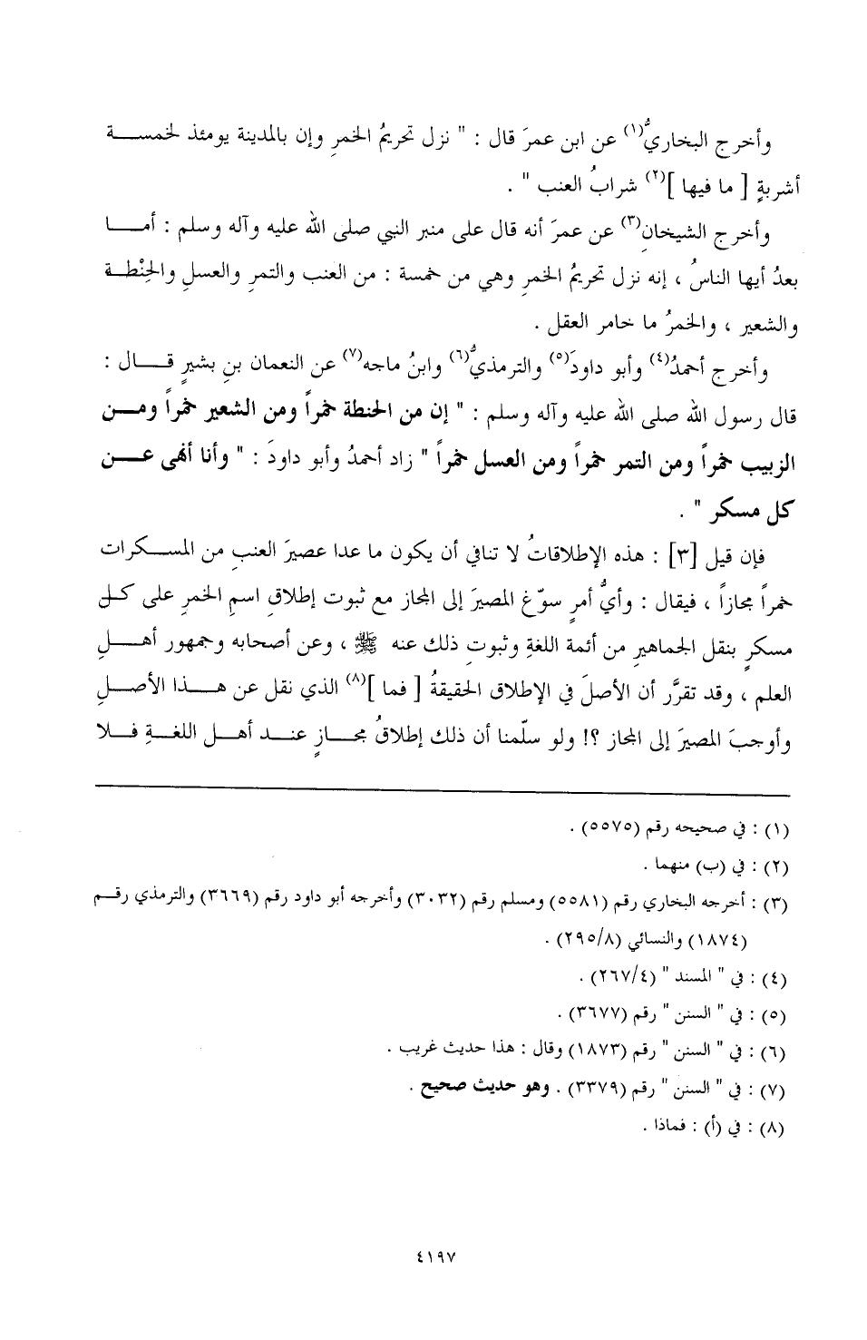 وأخرج أحمدُ (¬4) وأبو داود (¬5) والترمذيّ (¬6) وابن ماجه (¬7) عن النعمان بن بشير قال: قال رسول الله صَلَّى اللهُ عَلَيْهِ وَآلِهِ وَسَلَّمَ: "إن من الحنطة خمرًا ومن الشعير خمرًا ومن الزبيب خمرًا ومن التمر خمرًا ومن العسل خمرًا" زاد أحمدُ وأبو داود: "وأنا أنهى عن كل مسكر".