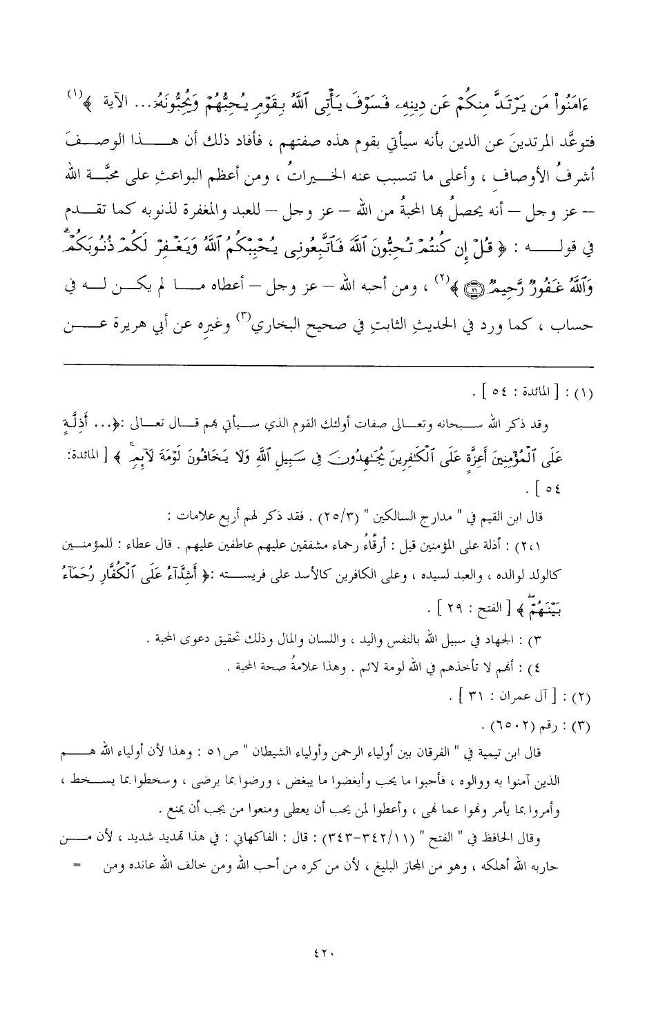 فتوعد المرتدين عن الدين بأنه سيأتي بقوم هذه صفتهم، فأفاد ذلك أن هذا الوصف أشرف الأوصاف، وأعلى ما تتسبب عنه الخيرات، ومن أعظم البواعث على محبة الله -عز وجل- أنه يحصل بها المحبة من الله -عز وجل- للعبد والمغفرة لذنوبه كما تقدم في قوله:} قل إن كنتم تحبون الله فاتبعوني يحببكم الله ويغفر لكم ذنوبكم والله غفور رحيم {(¬1)، ومن أحبه الله -عز وجل- أعطاه ما لم يكن له في حساب، كما ورد في الحديث الثابت في صحيح البخاري (¬2) وغيره عن أبي هريرة عن