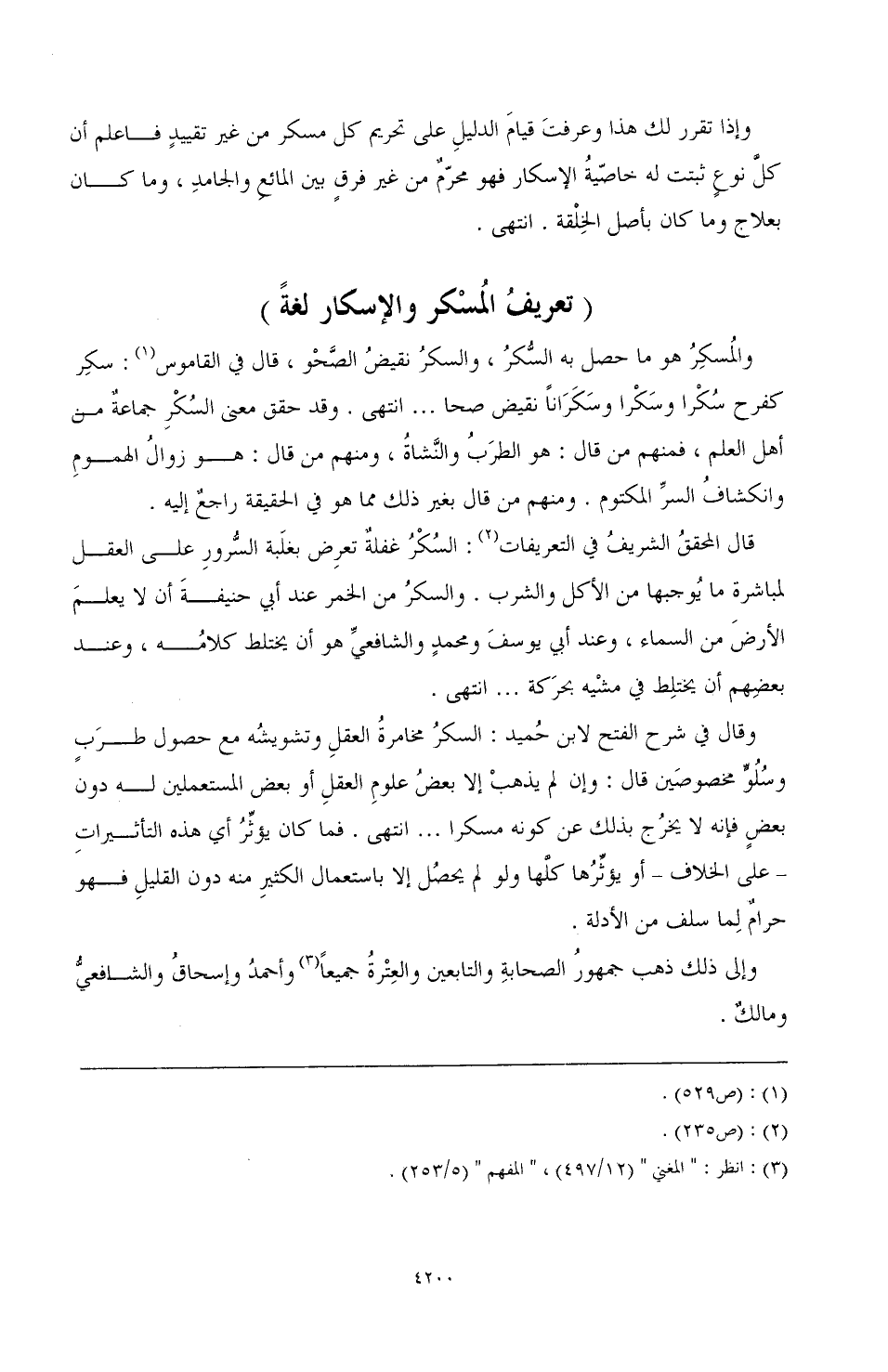 وقال في شرح الفتح لابن حُميد: السكرُ مخامرةُ العقلِ وتشويشُه مع حصول طرَبٍ وسُلُوٍّ مخصوصَين قال: وإن لم يذهب إلا بعضُ علومِ العقل أو بعض المستعملين له دون بعض فإنه لا يخرُج بذلك عن كونه مسكرًا ... انتهى. فما كان يؤثّرُ أي هذه التأثيرات ـ على الخلاف ـ أو يؤثّرُها كلَّها ولو لم يحصُل إلا باستعمال الكثير منه دون القليل فهو حرامٌ لِما سلف من الأدلة.