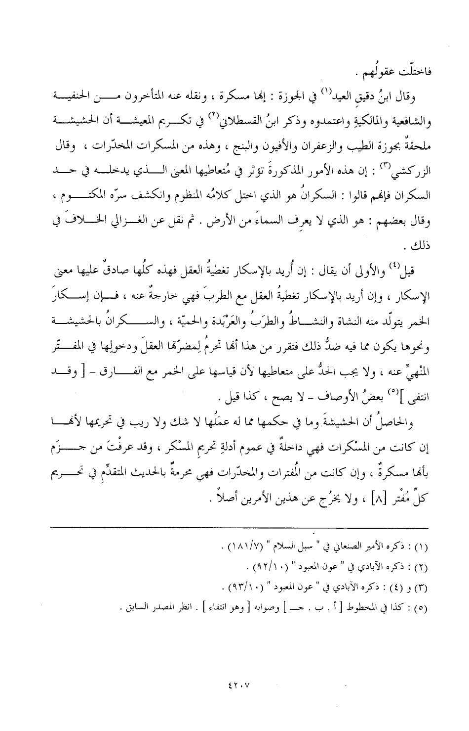 وقال ابن دقيق العيد (¬1) في الجوزة: إنها مسكرة، وقله عنه المتأخرون من الحنفية والشافعية والمالكية واعتمدوه وذكر ابنُ القسطلاني (¬2) في تكريم المعيشة أن الحشيشة ملحقةٌ بجوزة الطيب والزعفران والأفيون والبنج، وهذه من المسكرات المخدّرات، وقال الزركشي (¬3): إن هذه الأمور المذكورةَ تؤثر في مُتعاطيها المعنى الذي يدخله في حد السكران فإنهم قالوا: السكرانُ هو الذي اختل كلامهُ المنظوم وانشكف سرّه المكتوم، وقال بعضهم: هو الذي لا يعرِف السماءَ من الأرض. ثم نقل عن الغزالي الخلافَ في ذلك.