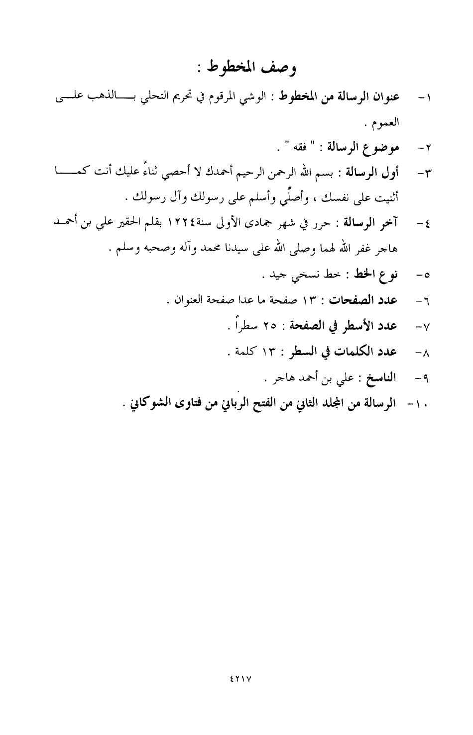 4 - آخر الرسالة: حرر في شهر جمادى الأ, لى سنة 1224 بقلم الحقير علي بن أحمد هاجر غفر الله لهما وصلى الله على سيدنا محمد وآله وصحبه وسلم.