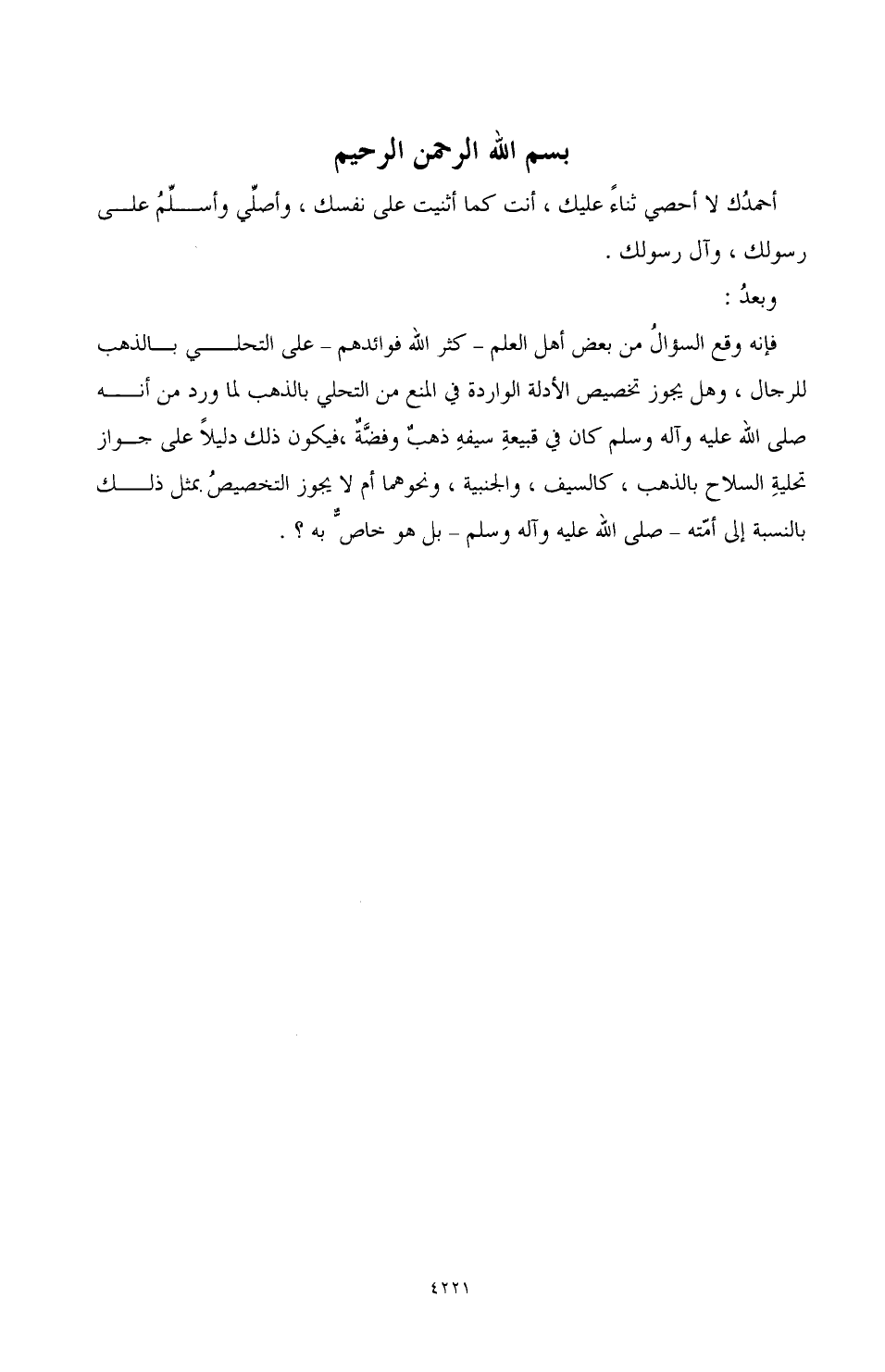 فإنه وقع السؤالُ من بعض أهل العلم ـ كثر الله فوائدهم ـ على التحلي بالذهب للرجال، وهل يجوز تخصيص الأدلة الواردة في المنع من التحلي بالذهب لما ورد من أنه صَلَّى اللهُ عَلَيْهِ وَآلِهِ وَسَلَّمَ كان في قبيعةِ سيفيهِ ذهبٌ وفضَّةٌ، فيكون ذلك دليلاً على جواز تحليلة السلاح بالذهب، كالسيف، والجنبية، ونحوهما أم لا يجوز التخصيصُ بمثل ذلك بالنسبة إلى أمّته ـ صَلَّى اللهُ عَلَيْهِ وَآلِهِ وَسَلَّمَ ـ بل هو خاصّ به؟.