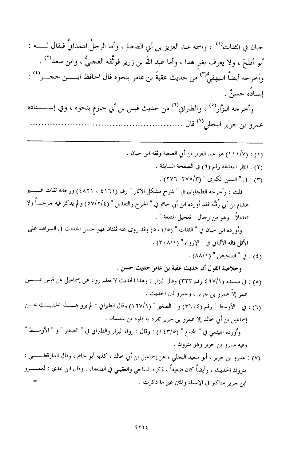 حبان في الثقات (¬1)، واسمه عبد العزيز بن أبي الصعبةِ، وأما الرجلُ الهمدانيُّ فيقال له: أبو أفلحَ، ولا يعرف بغير هذا، وأما عبد الله بن زرير فوثّقه العجليُّ، وابن سعد (¬2).