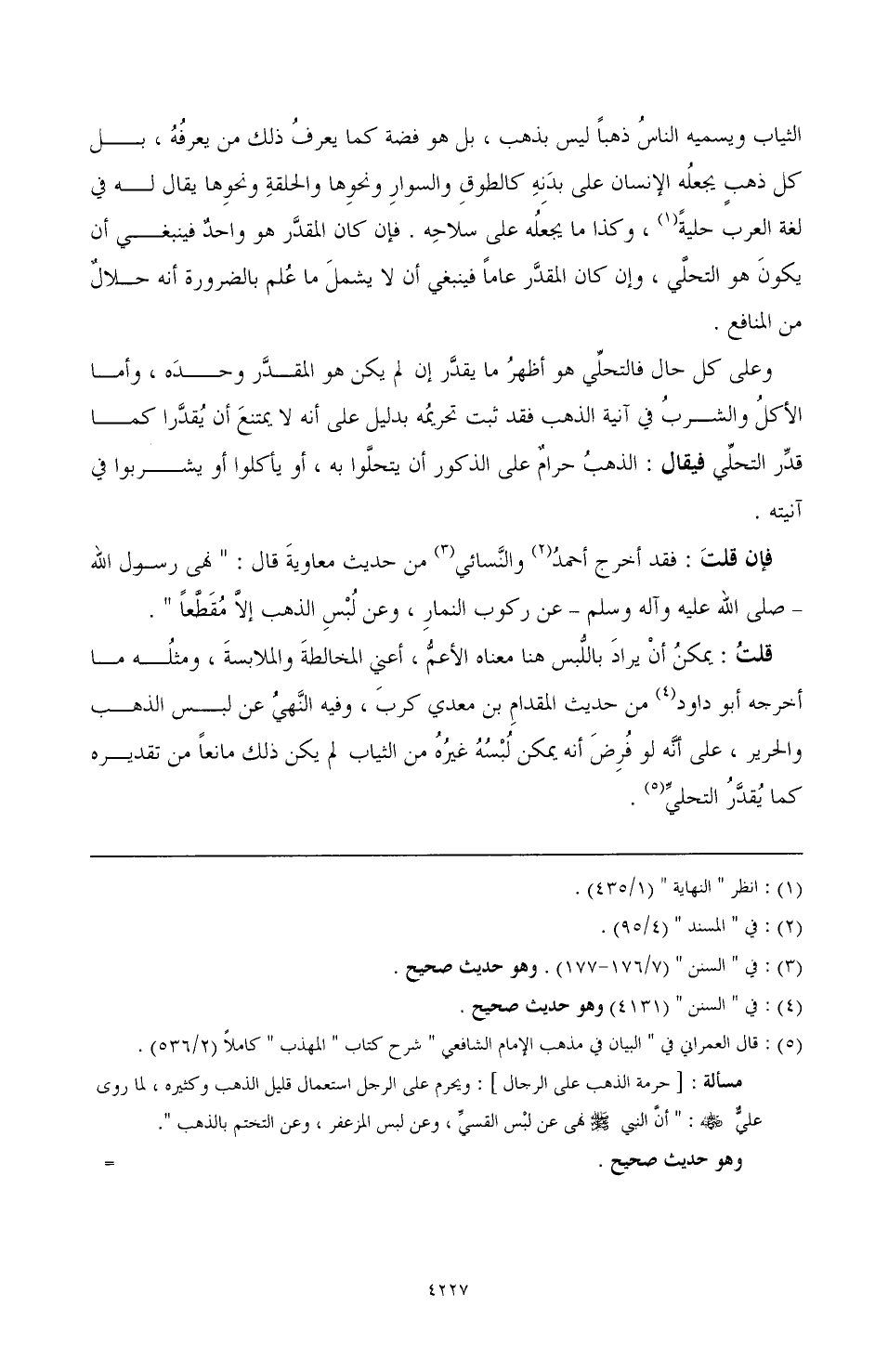الثياب ويسميه الناسُ ذهبًا ليس بذهب، بل هو فضة كما يعرفُ ذلك من يعرفُهُ، بل كل ذهبٍ يجعلُه الإنسان على بدَنِه كالطوقِ والسوارِ ونحوِها والحلقةِ ونحوِها يقال له في لغة العرب حليةً (¬1)، وكذا ما يجعلُه على سلاحِه. فإن كان المقدّر هو واحدٌ فينبغي أن يكون هو التحلِّي، وإن كان المقدر عامًّا فينبغي أن لا يشملَ ما عُلم بالضرورة أنه حلالٌ من المنافع.