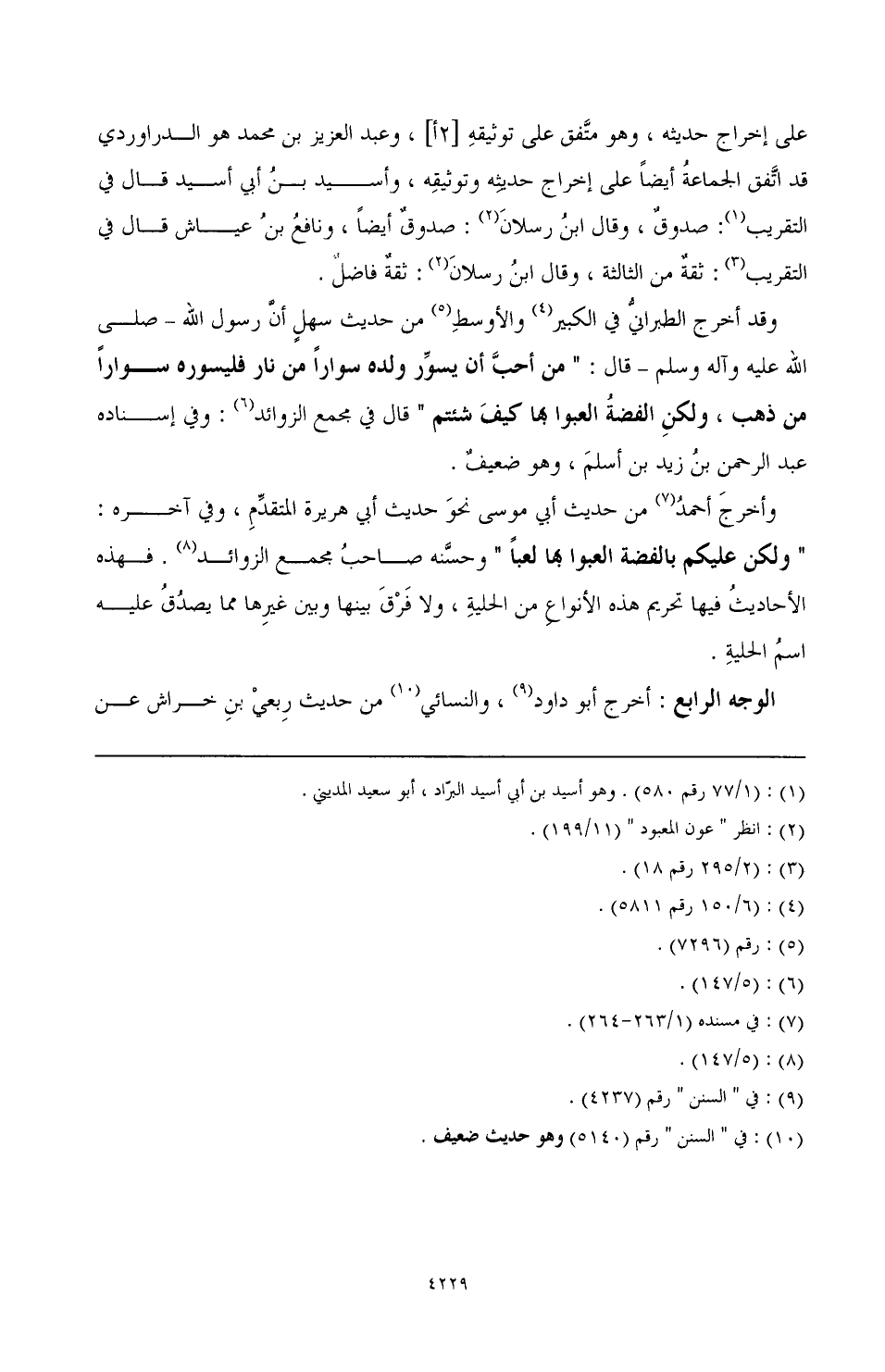 وقد أخرج الطبرانُّ في الكبير (¬5) والأوسط (¬6) من حديث سهلٍ أنَّ رسول الله ـ صَلَّى اللهُ عَلَيْهِ وَآلِهِ وَسَلَّمَ ـ قال: "من أحبَّ أن يسوِّر ولده سوارًا من نار فليسوره سوارًا من ذهب، ولكنِ الفضةُ العبوا بها كيف شئتم" قال في مجمع الزوائد (¬7): وفي إسناده عبد الرحمن بنُ زيد بن أسلمَ، وهو ضعيف.