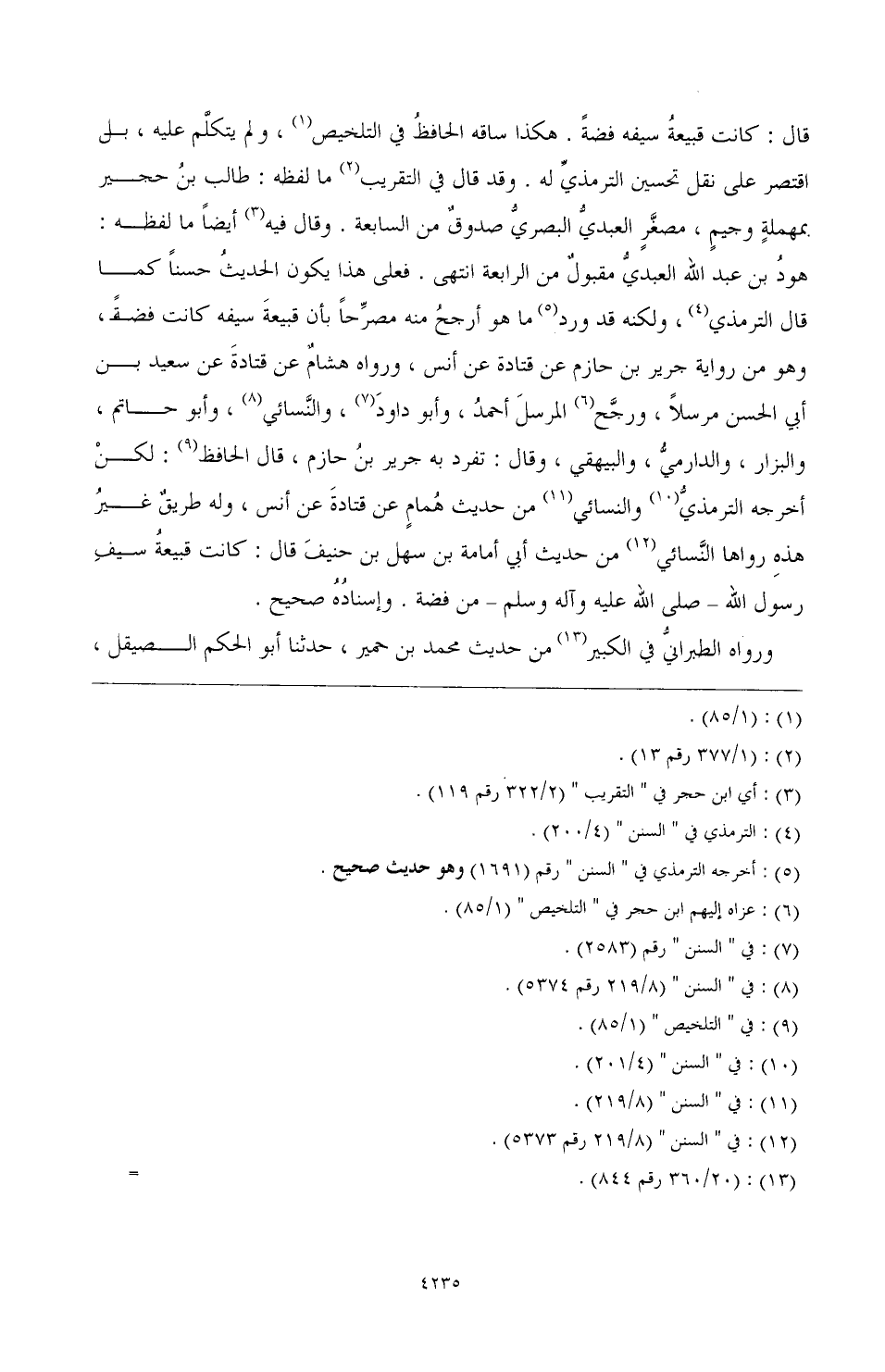 قال: كانت قبيعةُ سيفه فضةً. هكذا ساقه الحافظُ في التخليص (¬1)، ولم يتكلَّم عليه، بل اقتصر على نقل تحسين الترمذيّ له. وقد قال في التقريب (¬2) ما لفظه: طالب بنُ حجير بمهملةٍ وجيمٍ، مصغَّرٍ العبديُّ البصريُّ صدوقٌ من السابعة. وقال فيه (¬3) أيضًا ما لفظه: هودُ بن عبد الله العبديّ مقبولٌ من الرابعة انتهى. فعلى هذا يكون الحديثُ حسنًا كما قال الترمذي (¬4)، ولكنه قد ورد (¬5) ما هو أرجحُ منه مصرِّحًا بأن قبيعةَ سيفه كانت فضةً، وهو من رواية جرير بن حازم عن قتادة عن أنس، ورواه هشامٌ عن قتادةَ عن سعيد بن أبي الحسن مرسلاً، ورجَّح (¬6) المرسلَ أحمدُ، وأبو داودَ (¬7)، والنسائي (¬8)، وأبو حاتم، والبزار، والدارميُّ، والبيهقي، وقال: تفرد به جرير بنُ حازم، قال الحافظ (¬9): لكن أخرجه الترمذيُّ (¬10) والنسائي (¬11) من حديث هُمامٍ عن قتادةَ عن أنس، وله طريقٌ غيرُ هذه رواها النّسائي (¬12) من حديث أبي أمامة بن سهل بن حنيف قال: كانت قبيعة سيف رسول الله ـ صَلَّى اللهُ عَلَيْهِ وَآلِهِ وَسَلَّمَ ـ من فضة. وإسنادُهُ صحيح.