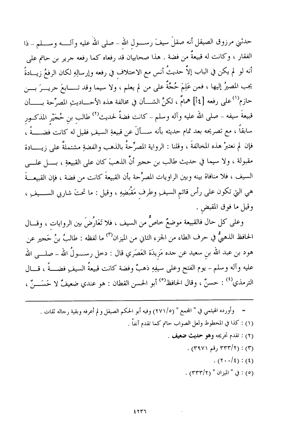 وعلى كل حال فالقبيعة موضعٌ خاصٌّ من السيف، فلا تَعَارُضَ بين الروايات، وقال الحافظ الذهبيُّ في حرف الطاء من الجزء الثاني من الميزان (¬3) ما لفظه: طالبُ بنُ حَجير عن هود بن عبد الله بنِ سعيد عن جده مَزِيدَة العَصري قال: دخل رسول الله ـ صَلَّى اللهُ عَلَيْهِ وَآلِهِ وَسَلَّمَ ـ يوم الفتح وعلى سيفِهِ ذهبٌ وفضة كانت قبيعةُ السيف فضةً، قال الترمذي (¬4): حسنٌ، وقال الحافظ (¬5) أبو الحسن القطان: هو عندي ضعيفٌ لا حَسَنٌ،