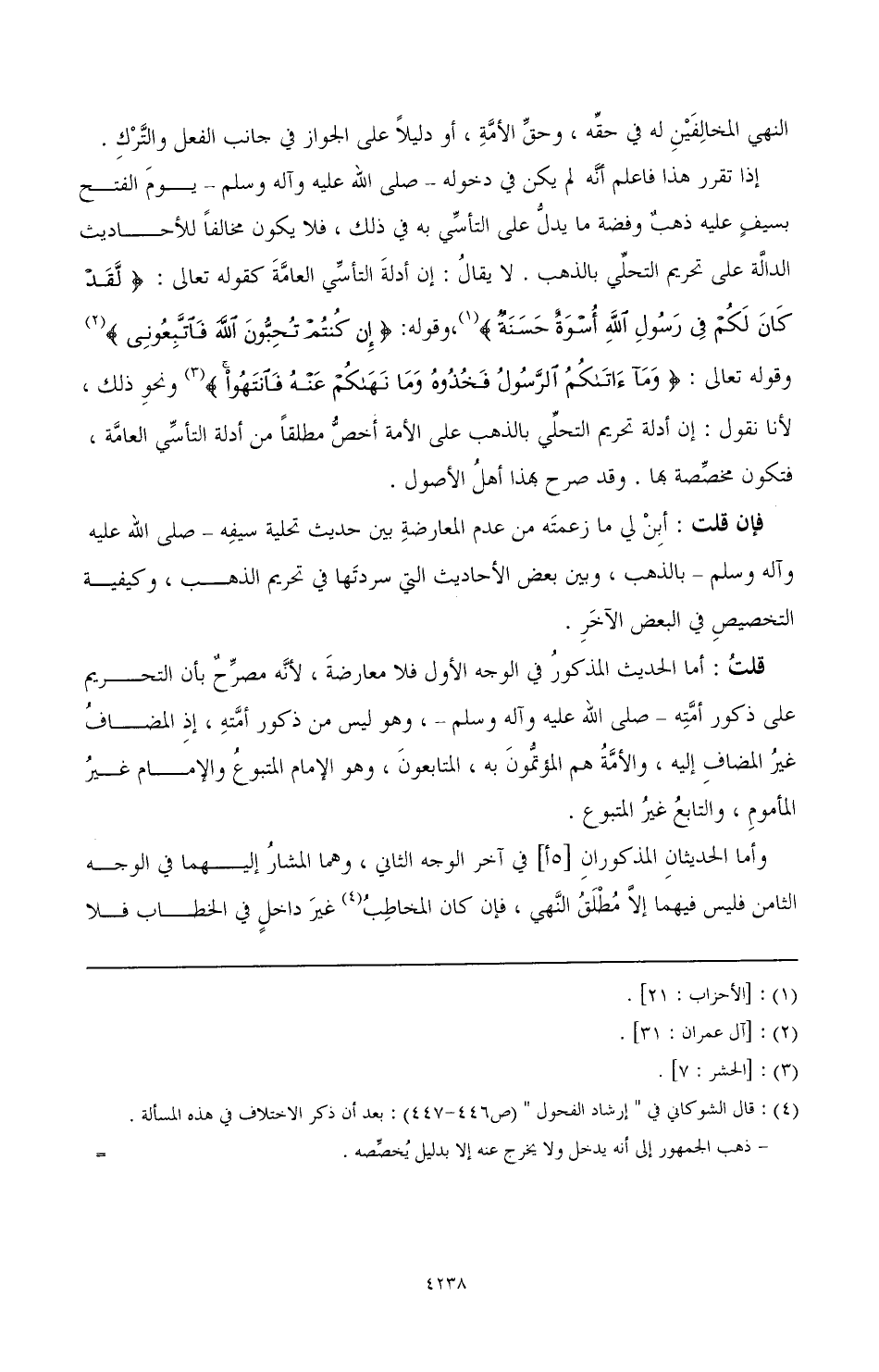 إذا تقرر هذا فاعلم أنّه لم يكن في دخوله ـ صَلَّى اللهُ عَلَيْهِ وَآلِهِ وَسَلَّمَ ـ يوم الفتح بسيف عليه ذهبٌ وفضة ما يدلُّ على التأسِّي به في ذلك، فلا يكون مخالفًا للأحاديث الدالّة على تحريم التحلّي بالذهب. لا يقالُ: إن أدلة التاسِّي العامّة كقوله تعالى: {لَقَدْ كَانَ لَكُمْ فِي رَسُولِ اللَّهِ أُسْوَةٌ حَسَنَةٌ} (¬1)، وقوله: {إِنْ كُنْتُمْ تُحِبُّونَ اللَّهَ فَاتَّبِعُونِي} (¬2) وقوله تعالى: {وَمَا آتَاكُمُ الرَّسُولُ فَخُذُوهُ وَمَا نَهَاكُمْ عَنْهُ فَانْتَهُوا} (¬3) ونحو ذلك، لأنا نقول: إن أدلة تحريم التحلِّي بالذهب على الأمة أخصُّ مطلقًا من أدلة التأسِّي العامّة، فتكون مخصِّصة بها. وقد صرح بهذا أهلُ الأصول.