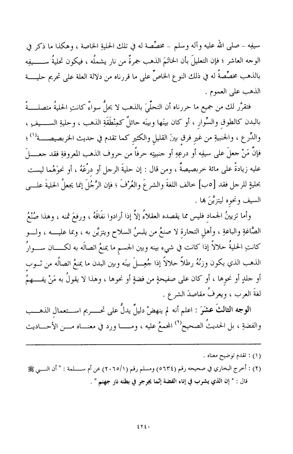 الوجه الثالثَ عشرَ: اعلم أنه لم ينهضْ دليلٌ على تحريم استعمالِ الذهب والفضةِ، بل الحديثُ الصحيح (¬2) المجمع عليه، وما ورد في معناه من الأحاديث