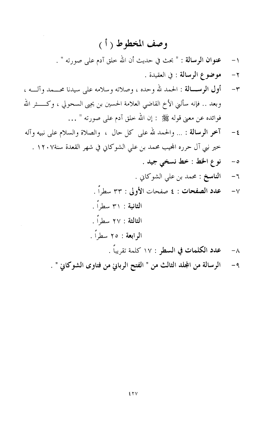 4 - آخر الرسالة: ... والحمد لله على كل حال، والصلاة والسلام على نبيه وآله خير نبي آل حرره المجيب محمد بن على الشوكاني في شهر القعدة سنة 1207.