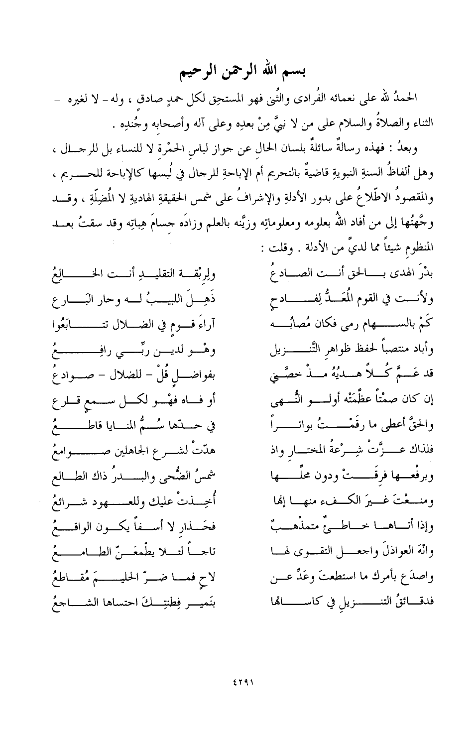 وبعد: فهذه رسالة سائلة بلسان الحال عن جواز لبس الحمرة لا للنساء، بل للرجال، وهل ألفاظ السنة النبوية قاضية بالتحريم أم الإباحة للرجال في لبسها كالإباحة للحريم؟ والمقصود الاطلاع على بدور الأدلة والإشراف على شمس الحقيقة الهادية لا المضلة، وقد وجهتها إلى من أفاد الله بعلومه ومعلوماته، وزينه بالعلم وزاده جسام هباته، وقد سقت بعد المنظوم شيئًا مما لدي من الأدلة، وقلت: