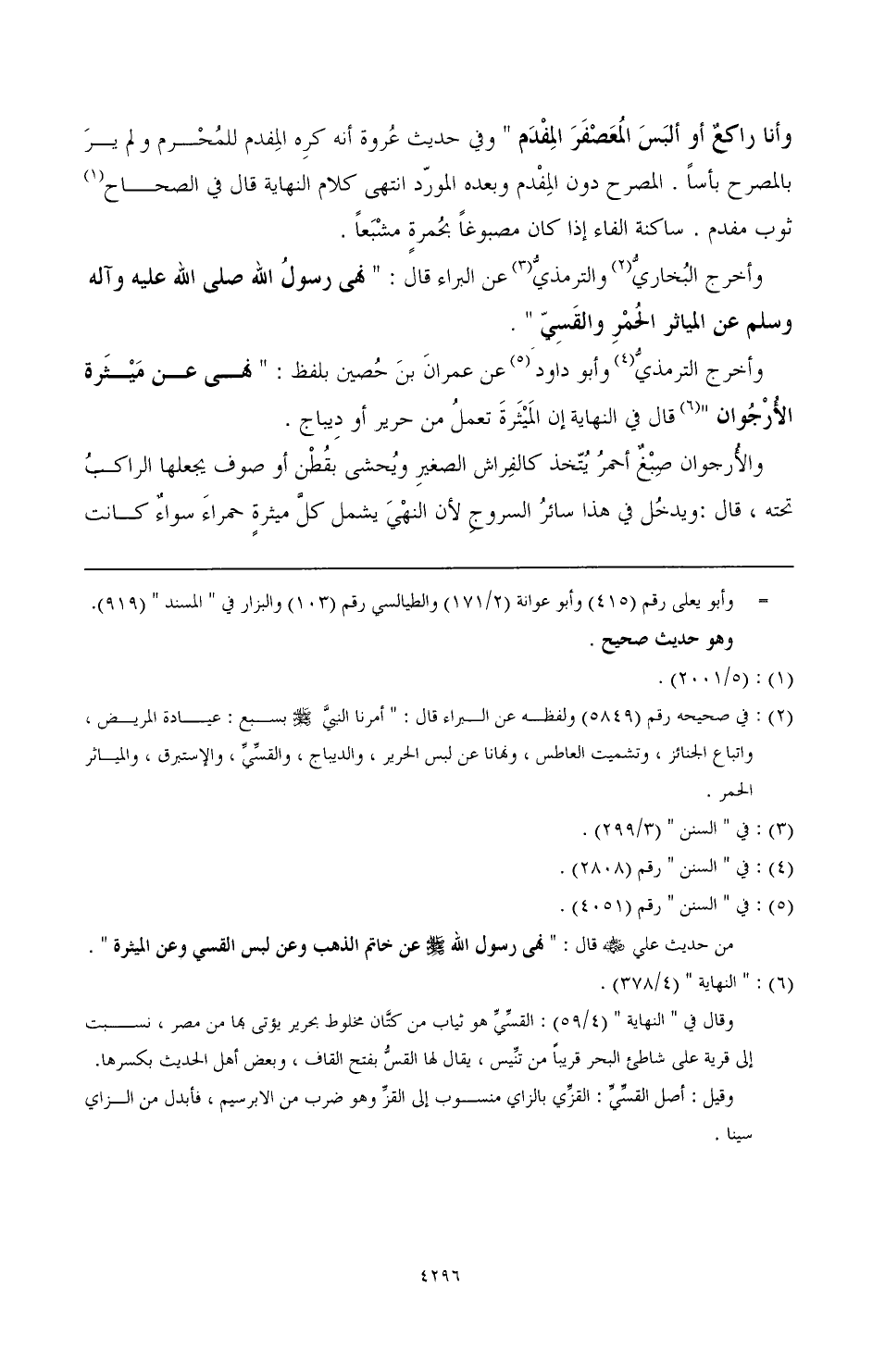 وأخرج البخاري (¬2) والترمذي (¬3) عن البراء قال: " نهى رسول الله - صَلَّى اللهُ عَلَيْهِ وَآلِهِ وَسَلَّمَ - عن المياثر الحمر والقسي ".