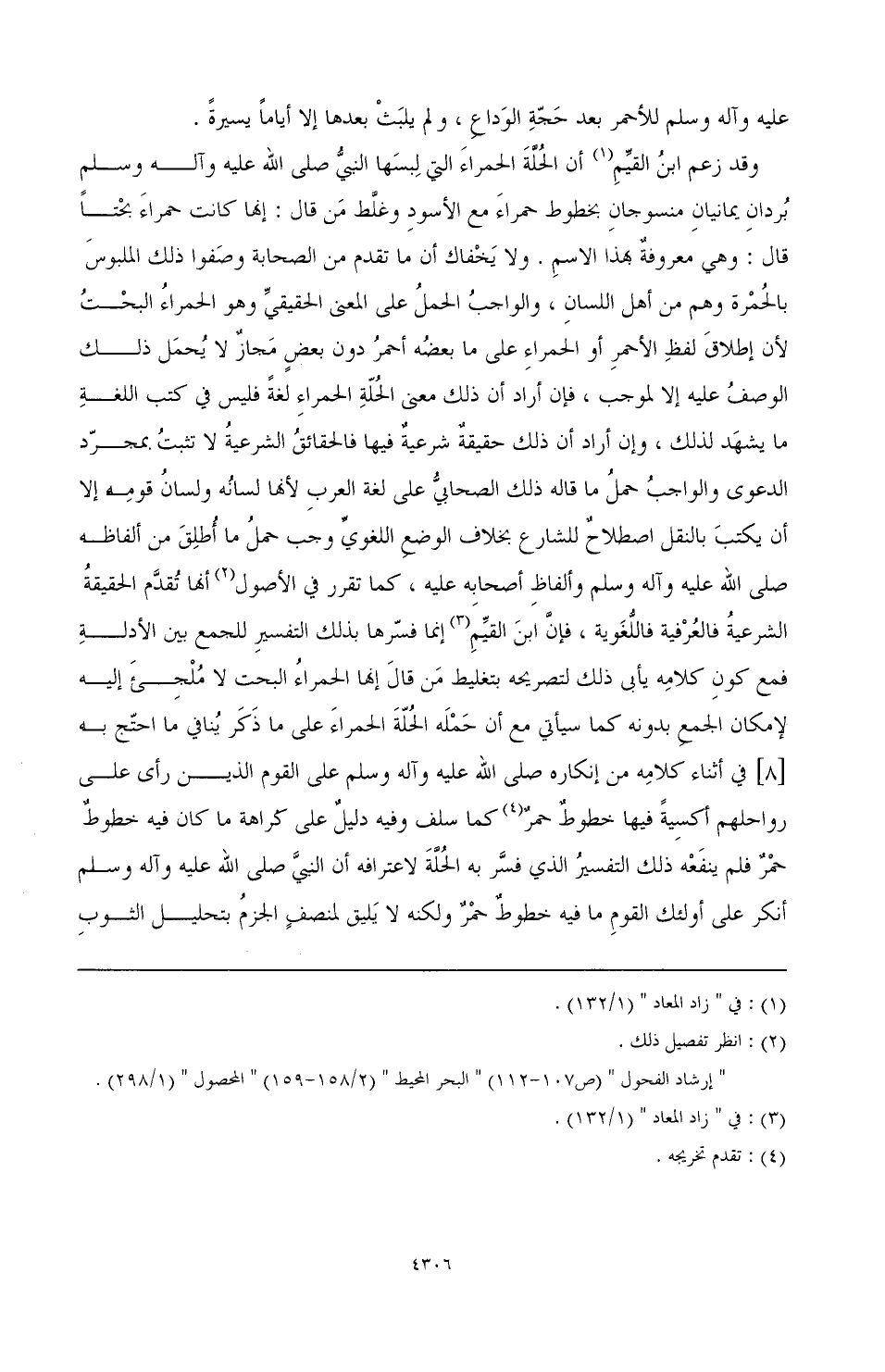 وقد زعم ابن القيم (¬1) أن الحلة الحمراء التي لبسها النبي - صَلَّى اللهُ عَلَيْهِ وَآلِهِ وَسَلَّمَ - بردان يمانيان منسوجان بخطوط حمراء مع الأسود، وغلط من قال: إنها كانت حمراء بحتًا، قال: وهي معروفة بهذا الاسم. ولا يخفاك أن ما تقدم من الصحابة وصفوا ذلك الملبوس بالحمرة، وهم من أهل اللسان، والواجب الحمل على المعنى الحقيقي وهو الحمراء البحت؛ لأن إطلاق لفظ الأحمر أو الحمراء على ما بعضه أحمر دون بعض مجاز لا يحمل ذلك الوصف عليه إلا لموجب، فإن أراد أن ذلك معنى الحلة الحمراء لغة فليس في كتب اللغة ما يشهد لذلك، وإن أراد أن ذلك حقيقة شرعية فيها فالحقائق الشرعية لا تثبت بمجرد الدعوى، والواجب حمل ما قاله ذلك الصحابي على لغة العرب؛ لأنها لسانه ولسان قومه إلا أن يكتب بالنقل اصطلاح للشارع بخلاف الوضع اللغوي وجب حمل ما أطلق من ألفاظه - صَلَّى اللهُ عَلَيْهِ وَآلِهِ وَسَلَّمَ - وألفاظ أصحابه عليه، كما تقرر في الأصول (¬2) أنها تقدم الحقيقة الشرعية فالعرفية فاللغوية، فإن ابن القيم (¬3) إنما فسرها بذلك التفسير؛ للجمع بين الأدلة، فمع كون كلامه يأبى ذلك لتصريحه بتغليط من قال: إنها الحمراء البحت لا ملجئ إليه لإمكان الجمع بدونه كما سيأتي، مع أن حمله الحلة الحمراء على ما ذكر ينافي ما احتج به [8] في أثناء كلامه من إنكاره - صَلَّى اللهُ عَلَيْهِ وَآلِهِ وَسَلَّمَ - على القوم الذين رأى على رواحلهم أكسية فيها خطوط حمر (¬4) كما سلف، وفيه دليل على كراهة ما كان فيه خطوط حمر، فلم ينفعه ذلك التفسير الذي فسر به الحلة؛ لاعترافه أن النبي - صَلَّى اللهُ عَلَيْهِ وَآلِهِ وَسَلَّمَ - أنكر على أولئك القوم ما فيه خطوط حمر، ولكنه لا يليق لمنصف الجزم بتحليل الثوب