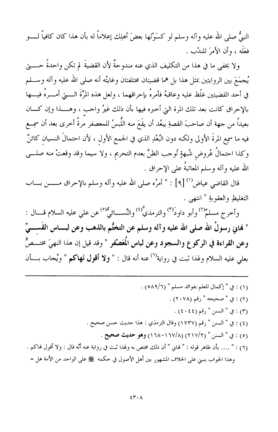 ولا يخفى ما في هذا من التكليف الذي عنه مندوحة؛ لأن القضية لم تكن واحدة حتى يجمع بين الروايتين بمثل هذا، بل هما قضيتان مختلفتان، وغايته أنه - صَلَّى اللهُ عَلَيْهِ وَآلِهِ وَسَلَّمَ - في أحد القضيتين غلّظ عليه وعاقبه فأمره بإحراقهما، ولعل هذه المرة التي أمره فيها بالإحراق كانت بعد تلك المرة التي أخبره فيها بأن ذلك غير واجب، وهذا وإن كان بعيدًا من جهة أن صاحب القصة يبعد أن يقع منه اللبس للمعصفر مرة أخرى بعد أن سمع فيه ما سمع المرة الأولى، ولكنه دون البعد الذي في الجمع الأول؛ لأن احتمال النسيان كائن، وكذا احتمال عروض شبهة توجب الظن بعدم التحريم، ولا سيما وقد وقعت منه - صَلَّى اللهُ عَلَيْهِ وَآلِهِ وَسَلَّمَ - المعاتبة على الإحراق.