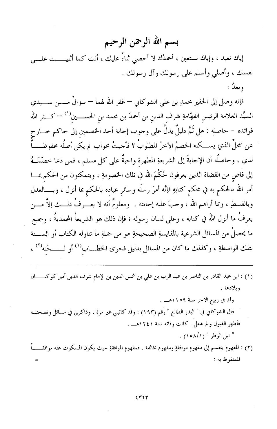 فإنه وصل إلى الفقير محمد بن علي الشوكاني - غفر الله لهما - سؤال من سيدي السيد العلامة الرئيس الفهامة شرف الدين بن أحمد بن محمد بن الحسين (¬1) - كثر الله فوائده - حاصله: هل ثم دليل يدل على وجوب إجابة أحد الخصمين إلى حاكم خارج عن المحل الذي يسكنه الخصم الآخر المطلوب؟ فأجبت بجواب لم يكن أصله محفوظًا لدي، وحاصله أن الإجابة إلى الشريعة المطهرة واجبة على كل مسلم، فمن دعا خصمه إلى قاض من القضاة الذين يعرفون حكم الله في تلك الخصومة، ويتمكنون من الحكم بما أمر الله بالحكم به في محكم كتابه، فإنه أمر رسله وسائر عباده بالحكم بما أنزل، وبالعدل وبالقسط، وبما أراهم الله، وجب عليه إجابته. ومعلوم أنه لا يعرف ذلك إلا من يعرف ما أنزل الله في كتابه وعلى لسان رسوله؛ فإن ذلك هو الشريعة المحمدية، وجميع ما يحصل من المسائل الشرعية بالمقايسة الصحيحة هو من جملة ما تناوله الكتاب أو السنة بتلك الواسطة، وكذلك ما كان من المسائل بدليل فحوى الخطاب (¬2) أو لحنه (¬3)،