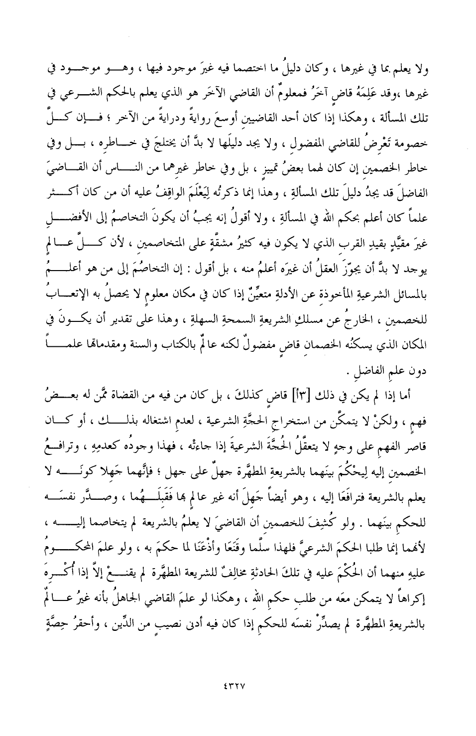 ولا يعلم بما في غيرها، وكان دليل ما اختصما فيه غير موجود فيها، وهو موجود في غيرها، وقد علمه قاض آخر، فمعلوم أن القاضي الآخر هو الذي يعلم بالحكم الشرعي في تلك المسألة، وهكذا إذا كان أحد القاضيين أوسع رواية ودراية من الآخر، فإن كل خصومة تعرض للقاضي المفضول ولا يجد دليلها لا بد أن يختلج في خاطره، بل وفي خاطر الخصمين إن كان لهما بعض تمييز، بل وفي خاطر غيرهما من الناس أن القاضي الفاضل قد يجد دليل تلك المسألة، وهذا إنما ذكرته ليعلم الواقف عليه أن من كان أكثر علمًا كان أعلم بحكم الله في المسألة، ولا أقول: إنه يجب أن يكون التخاصم إلى الأفضل غير مقيد بقيد القرب الذي لا يكون فيه كثير مشقة على المتخاصمين؛ لأن كل عالم يوجد لا بد أن يجوز العقل أن غيره أعلم منه، بل أقول: إن التخاصم إلى من هو أعلم بالمسائل الشرعية المأخوذة عن الأدلة متعين إذا كان في مكان معلوم لا يحصل به الإتعاب للخصمين، الخارج عن مسلك الشريعة السمحة السهلة، وهذا على تقدير أن يكون في المكان الذي يسكنه الخصمان قاض مفضول، لكنه عالم بالكتاب والسنة ومقدماتها علمًا دون علم الفاضل.