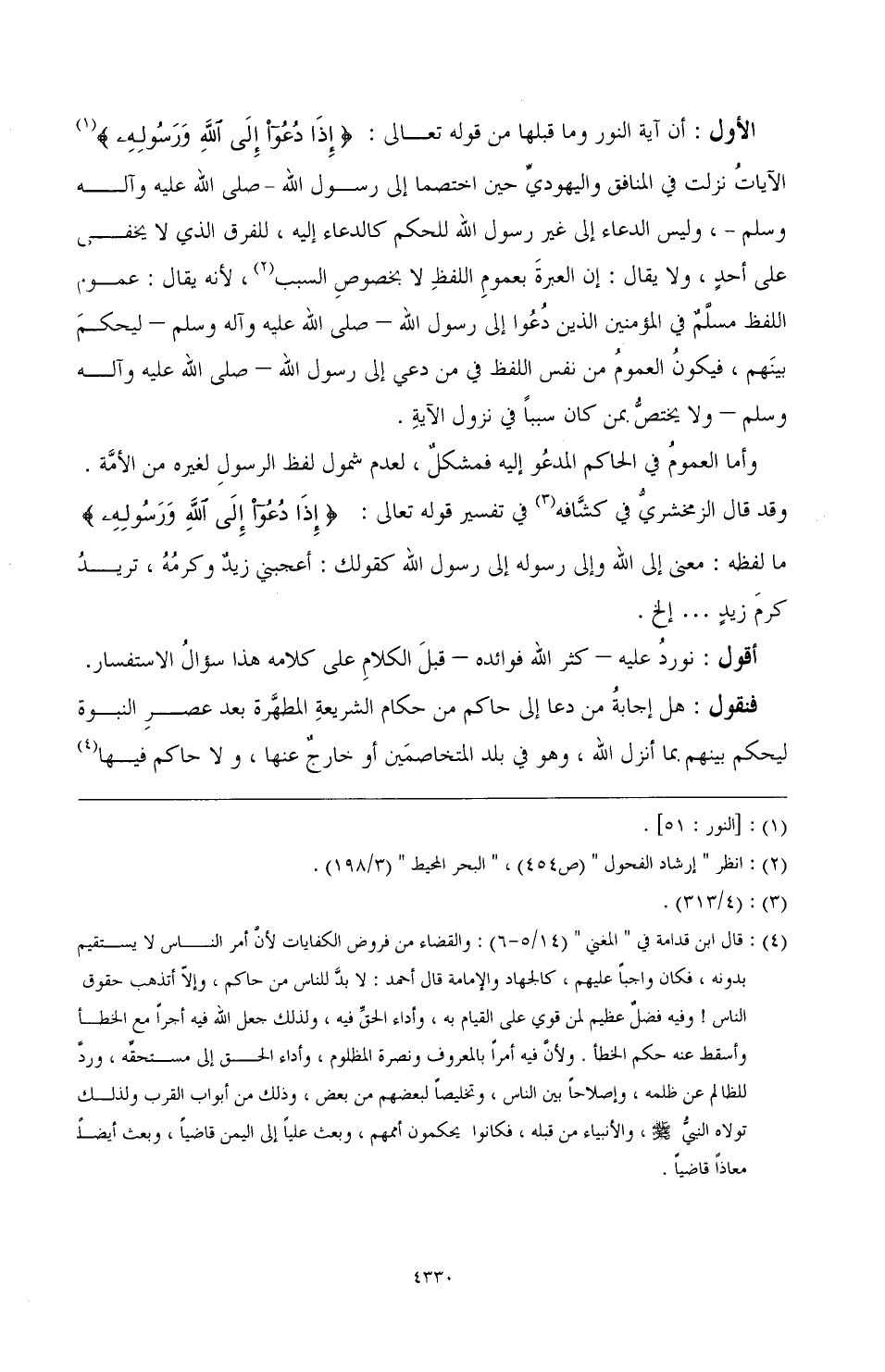 وأما العموم في الحاكم المدعو إليه فمشكل؛ لعدم شمول لفظ الرسول لغيره من الأمة. وقد قال الزمخشري في كشافه (¬3) في تفسير قوله تعالى: {إذا دعوا إلى الله ورسوله} ما لفظه: معنى: إلى الله وإلى رسوله: إلى رسول الله، كقولك: أعجبني زيد وكرمه، تريد كرم زيد. . . إلخ.