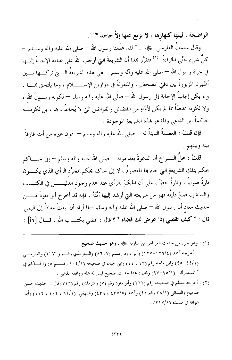 قلت: محل النزاع أن الدعوة بعد موته - صَلَّى اللهُ عَلَيْهِ وَآلِهِ وَسَلَّمَ - إلى حاكم يحكم بتلك الشريعة التي جاء بها المعصوم، لا إلى حاكم يحكم بمجرد الرأي الذي يكون تارة صوابًا وتارة خطأ، على أن الحكم بالرأي عند عدم وجود الدليل في الكتاب والسنة إن صح دليله فهو من شريعته التي أرشد إليها أمته، فإنه قد أخرج أبو داود من حديث معاذ أن رسول الله - صَلَّى اللهُ عَلَيْهِ وَآلِهِ وَسَلَّمَ - لما أراد أن يبعث معاذًا إلى اليمن قال: " كيف تقضي إذا عرض لك قضاء؟ " قال: أقضي بكتاب الله، قال [6أ]: