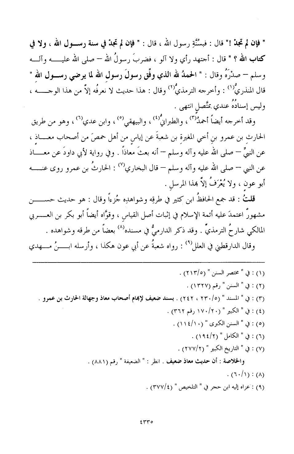 " فإن لم تجد؟ " قال: فبسنة رسول الله، قال: " فإن لم تجد في سنة رسول الله، ولا في كتاب الله؟ " قال: أجتهد رأيي ولا آلو، فضرب رسول الله - صَلَّى اللهُ عَلَيْهِ وَآلِهِ وَسَلَّمَ - صدره وقال: " الحمد لله الذي وفق رسول رسول الله لما يرضي رسول الله " قال المنذري (¬1): وأخرجه الترمذي (¬2) وقال: هذا حديث لا نعرفه إلا من هذا الوجه، وليس إسناده عندي بمتصل. انتهى.