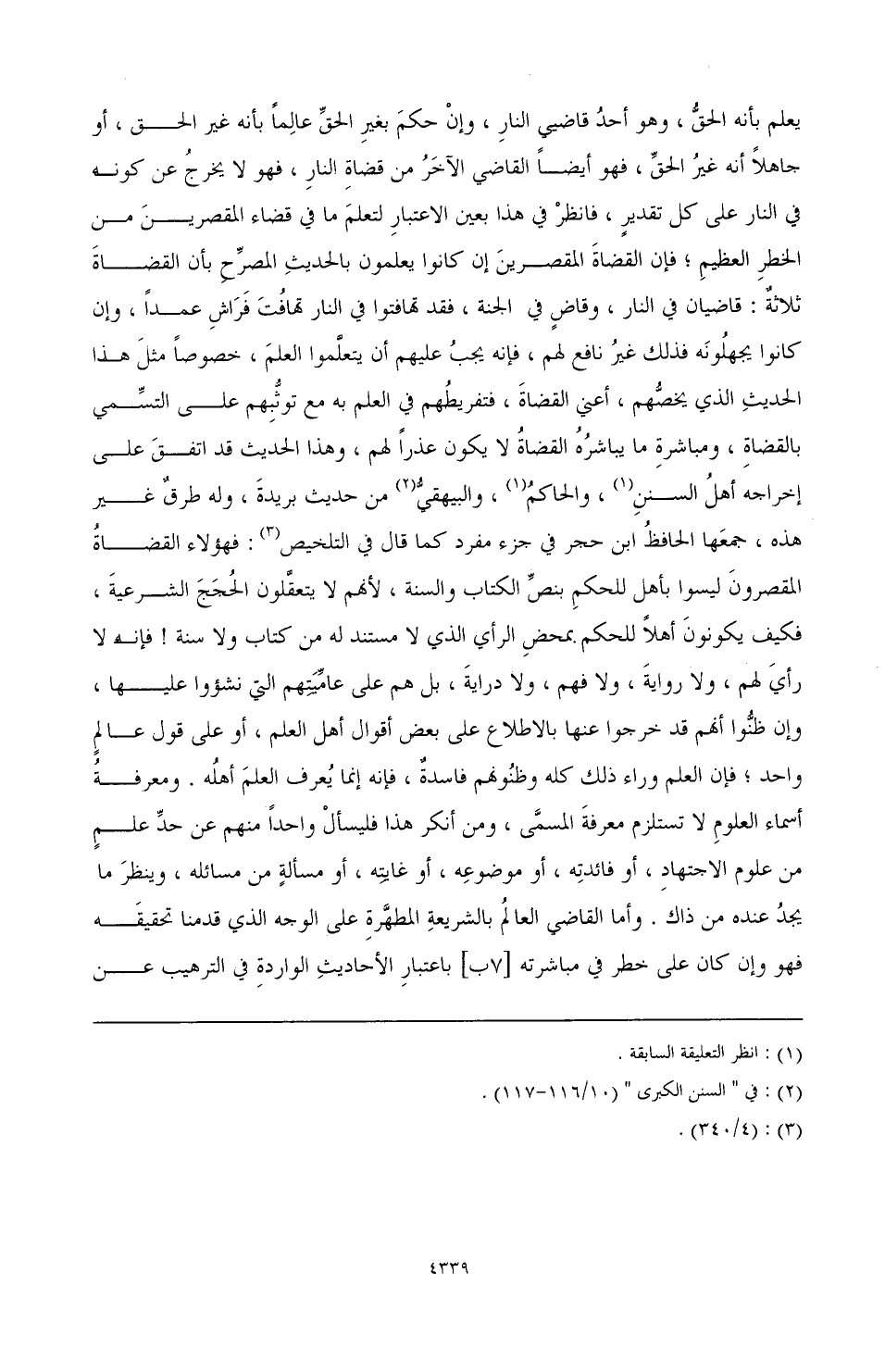 يعلم بأنه الحق، وهو أحد قاضيي النار، وإن حكم بغير الحق عالمًا بأنه غير الحق، أو جاهلاً أنه غير الحق، فهو أيضًا القاضي الآخر من قضاة النار، فهو لا يخرج عن كونه في النار على كل تقدير، فانظر في هذا بعين الاعتبار؛ لتعلم ما في قضاء المقصرين من الخطر العظيم، فإن القضاة المقصرين إن كانوا يعلمون بالحديث المصرح بأن القضاة ثلاثة: قاضيان في النار، وقاض في الجنة، فقد تهافتوا في النار تهافت فراش عمدًا، وإن كانوا يجهلونه فذلك غير نافع لهم، فإنه يجب عليهم أن يتعلموا العلم، خصوصًا مثل هذا الحديث الذي يخصهم، أعني القضاة، فتفريطهم في العلم به مع توثبهم على التسمي بالقضاة ومباشرة ما يباشره القضاة لا يكون عذرًا لهم، وهذا الحديث قد اتفق على إخراجه أهل السنن (¬1)، والحاكم (¬2)، والبيهقي (¬3) من حديث بريدة، وله طرق غير هذه، جمعها الحافظ ابن حجر في جزء مفرد كما قال في التلخيص (¬4): فهؤلاء القضاة المقصرون ليسوا بأهل للحكم بنص الكتاب والسنة؛ لأنهم لا يتعقلون الحجج الشرعية، فكيف يكونون أهلاً للحكم بمحض الرأي الذي لا مستند له من كتاب ولا سنة! فإنه لا رأي لهم، ولا رواية، ولا فهم، ولا دراية، بل هم على عاميتهم التي نشؤوا عليها، وإن ظنوا أنهم قد خرجوا عنها بالاطلاع على بعض أقوال أهل العلم، أو على قول عالم واحد، فإن العلم وراء ذلك كله وظنونهم فاسدة، فإنه إنما يعرف العلم أهله. ومعرفة أسماء العلوم لا تستلزم معرفة المسمى، ومن أنكر هذا فليسأل واحدًا منهم عن حد علم من علوم الاجتهاد، أو فائدته، أو موضوعه، أو غايته، أو مسألة من مسائله، وينظر ما يجد عنده من ذاك. وأما القاضي العالم بالشريعة المطهرة على الوجه الذي قدمنا تحقيقه فهو وإن كان على خطر في مباشرته [7ب] باعتبار الأحاديث الواردة في الترهيب عن