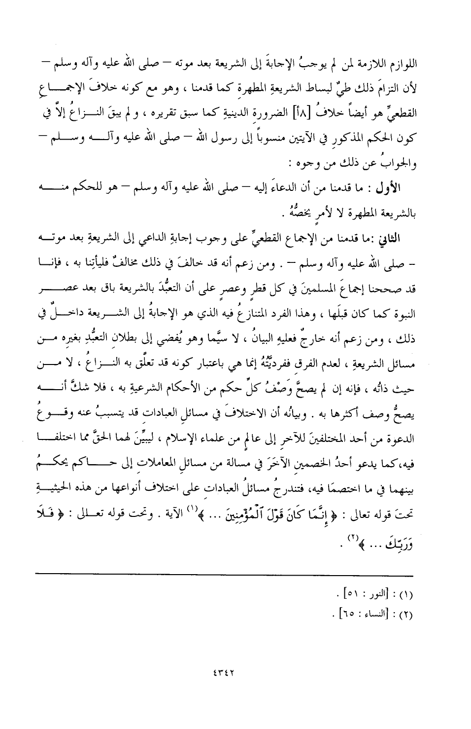 الثاني: ما قدمنا من الإجماع القطعي على وجوب إجابة الداعي إلى الشريعة بعد موته - صَلَّى اللهُ عَلَيْهِ وَآلِهِ وَسَلَّمَ -. ومن زعم أنه قد خالف في ذلك مخالف فليأتنا به، فإنا قد صححنا إجماع المسلمين في كل قطر وعصر على أن التعبد بالشريعة باق بعد عصر النبوة كما كان قبلها، وهذا الفرد المتنازع فيه الذي هو الإجابة إلى الشريعة داخل في ذلك، ومن زعم أنه خارج فعليه البيان، لا سيما وهو يفضي إلى بطلان التعبد بغيره من مسائل الشريعة؛ لعدم الفرق، ففرديته إنما هي باعتبار كونه قد تعلق به النزاع، لا من حيث ذاته، فإنه إن لم يصح وصف كل حكم من الأحكام الشرعية به، فلا شك أنه يصح وصف أكثرها به. وبيانه أن الاختلاف في مسائل العبادات قد يتسبب عنه وقوع الدعوة من أحد المختلفين للآخر إلى عالم من علماء الإسلام؛ ليبين لهما الحق مما اختلفا فيه، كما يدعو أحد الخصمين الآخر في مسألة من مسائل المعاملات إلى حاكم يحكم بينهما في ما اختصما فيه، فتندرج مسائل العبادات على اختلاف أنواعها من هذه الحيثية تحت قوله تعالى: {إنما كان قول المؤمنين. . .} (¬1) الآية. وتحت قوله تعالى: {فلا وربك. . .} (¬2).