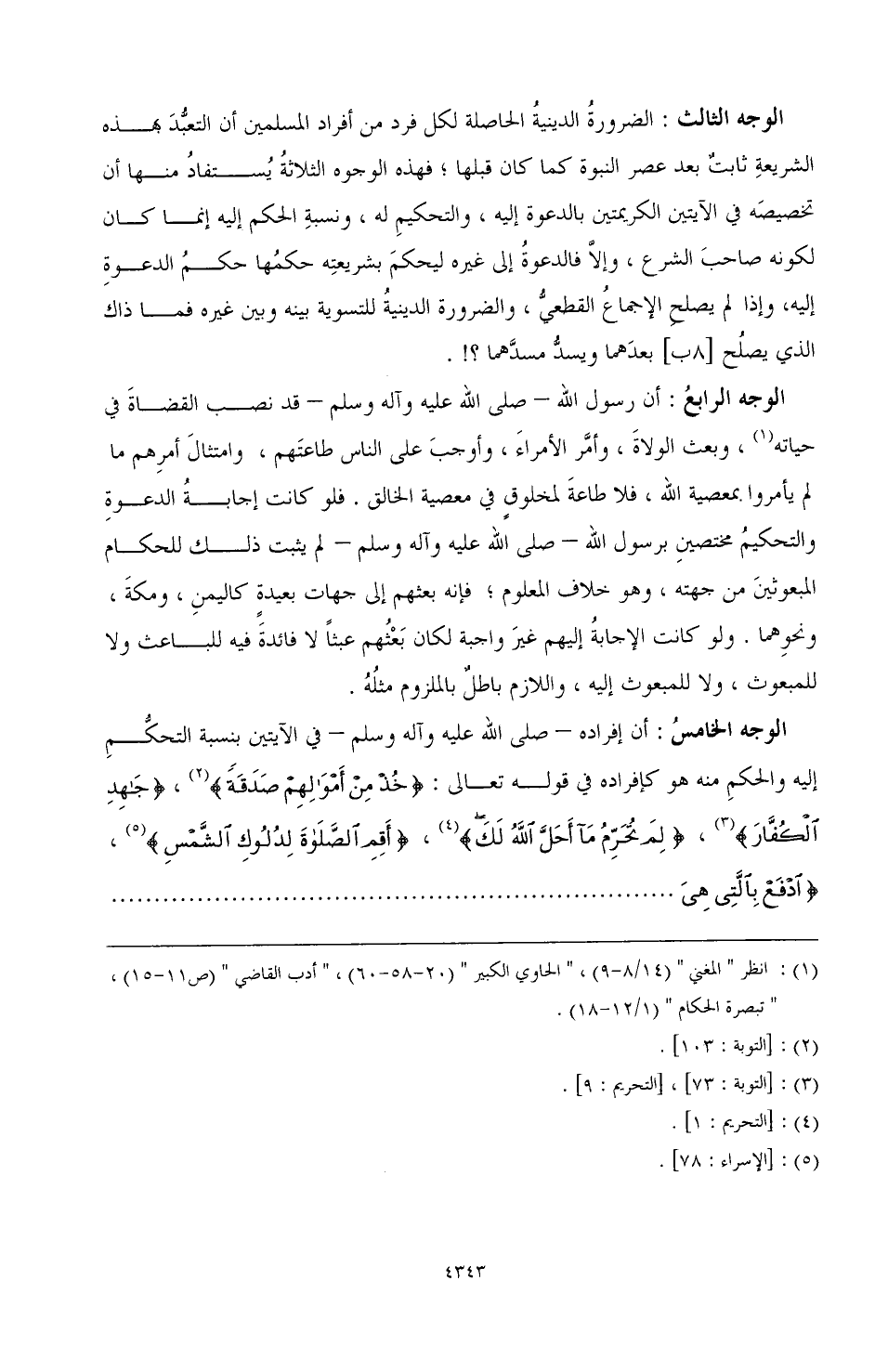 الوجه الخامس: أن إفراده - صَلَّى اللهُ عَلَيْهِ وَآلِهِ وَسَلَّمَ - في الآيتين بنسبة التحكم إليه والحكم منه هو كإفراده في قوله تعالى: {خذ من أموالهم صدقة} (¬2)، {جاهد الكفار} (¬3)، {لم تحرم ما أحل الله لك} (¬4)، {أقم الصلاة لدلوك الشمس} (¬5)، {ادفع بالتي هي