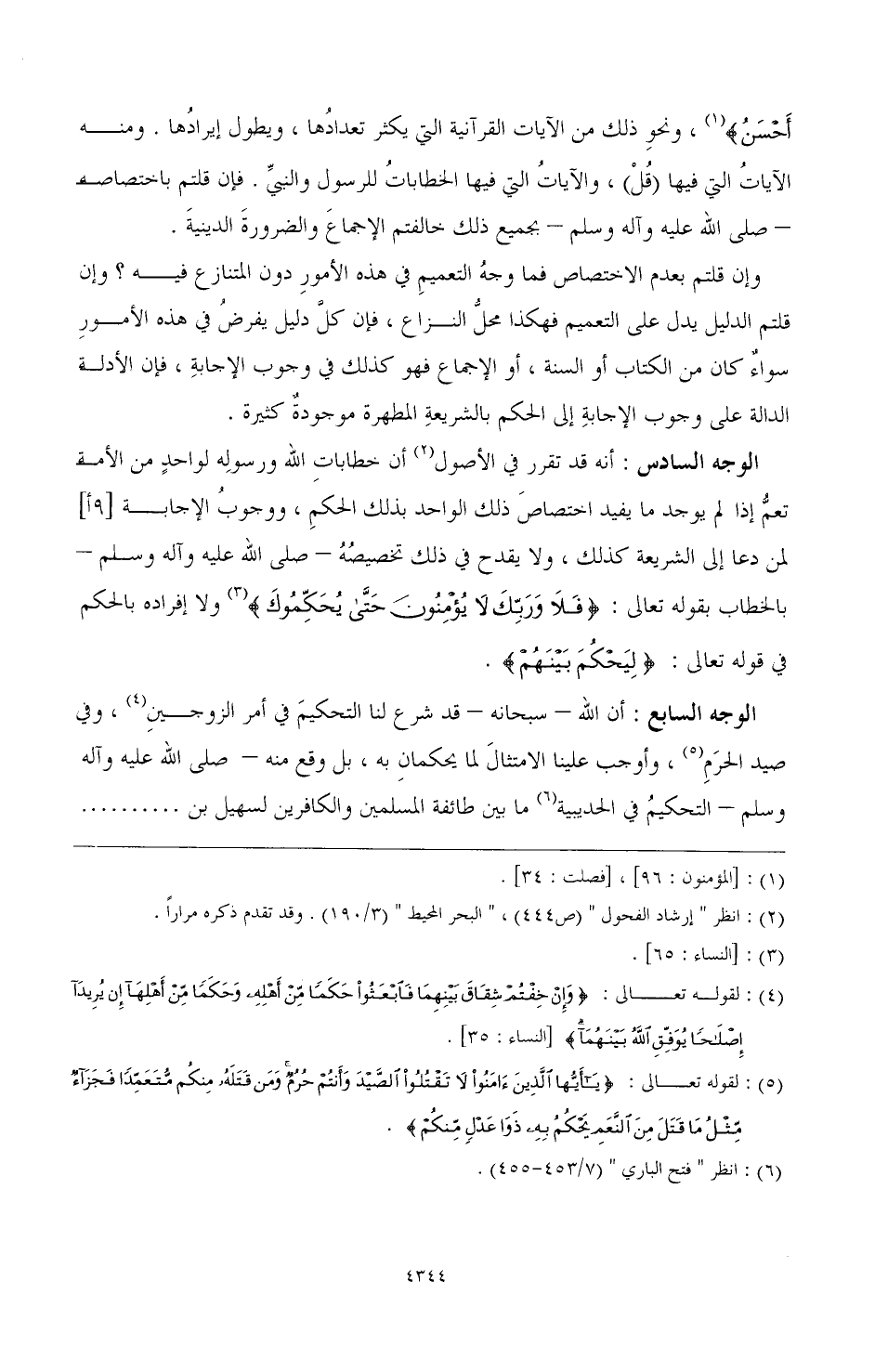 الوجه السادس: أنه قد تقرر في الأصول (¬2) أن خطابات الله ورسوله لواحد من الأمة تعم إذا لم يوجد ما يفيد اختصاص ذلك الواحد بذلك الحكم، ووجوب الإجابة [9أ] لمن دعا إلى الشريعة كذلك، ولا يقدح في ذلك تخصيصه - صَلَّى اللهُ عَلَيْهِ وَآلِهِ وَسَلَّمَ - بالخطاب بقوله تعالى: {فلا وربك لا يؤمنون حتى يحكموك} (¬3) ولا إفراده بالحكم في قوله تعالى: {ليحكم بينهم}.