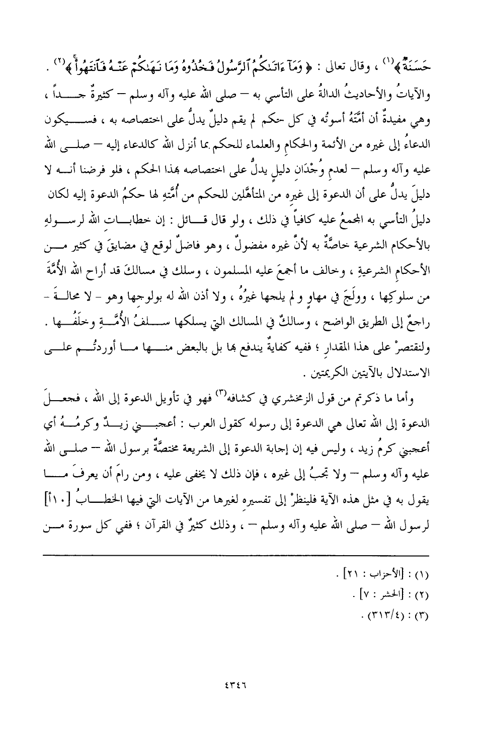 وقال تعالى: {وما آتاكم الرسول فخذوه وما نهاكم عنه فانتهوا} (¬1). والآيات والأحاديث الدالة على التأسي به - صَلَّى اللهُ عَلَيْهِ وَآلِهِ وَسَلَّمَ - كثيرة جدًا، وهي مفيدة أن أمته أسوته في كل حكم لم يقم دليل يدل على اختصاصه به، فسيكون الدعاء إلى غيره من الأئمة والحكام والعلماء للحكم بما أنزل الله كالدعاء إليه - صَلَّى اللهُ عَلَيْهِ وَآلِهِ وَسَلَّمَ - لعدم وجدان دليل يدل على اختصاصه بهذا الحكم، فلو فرضنا أنه لا دليل يدل على أن الدعوة إلى غيره من المتأهلين للحكم من أمته لها حكم الدعوة إليه لكان دليل التأسي به المجمع عليه كافيًا في ذلك، ولو قال قائل: إن خطابات الله لرسوله بالأحكام الشرعية خاصة به لأن غيره مفضول، وهو فاضل لوقع في مضايق في كثير من الأحكام الشرعية، وخالف ما أجمع عليه المسلمون، وسلك في مسالك قد أراح الله الأمة من سلوكها، وولج في مهاوٍ ولم يلجها غيره، ولا أذن الله له بولوجها وهو - لا محالة - راجع إلى الطريق الواضح، وسالك في المسالك التي يسلكها سلف الأمة وخلفها. ولنقتصر على هذا المقدار؛ ففيه كفاية يندفع بها بل بالبعض منها ما أوردتم على الاستدلال بالآيتين الكريمتين.