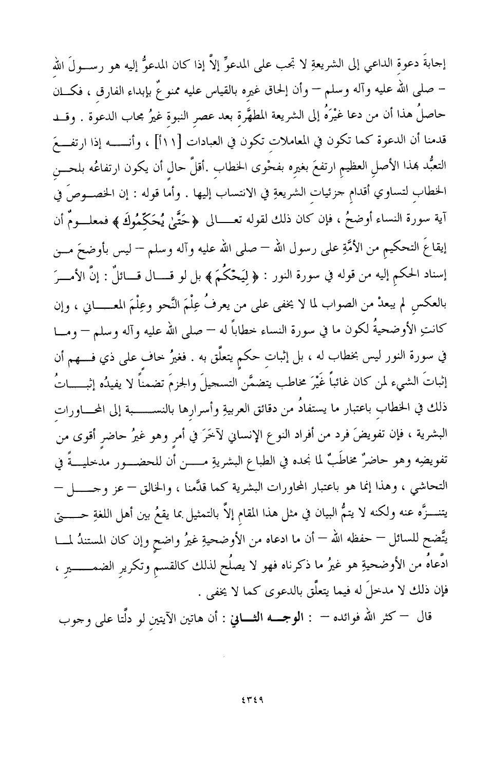إجابة دعوة الداعي إلى الشريعة لا تجب على المدعو إلا إذا كان المدعو إليه هو رسول الله - صَلَّى اللهُ عَلَيْهِ وَآلِهِ وَسَلَّمَ - وأن إلحاق غيره بالقياس عليه ممنوع بإبداء الفارق، فكان حاصل هذا أن من دعا غيره إلى الشريعة المطهرة بعد عصر النبوة غير مجاب الدعوة. وقد قدمنا أن الدعوة كما تكون في المعاملات تكون في العبادات [11أ]، وأنه إذا ارتفع التعبد بهذا الأصل العظيم ارتفع بغيره بفحوى الخطاب. أقل حال أن يكون ارتفاعه بلحن الخطاب لتساوي أقدام جزئيات الشريعة في الانتساب إليها. وأما قوله: إن الخصوص في آية سورة النساء أوضح، فإن كان ذلك لقوله تعالى: {حتى يحكموك} فمعلوم أن إيقاع التحكيم من الأمة على رسول الله - صَلَّى اللهُ عَلَيْهِ وَآلِهِ وَسَلَّمَ - ليس بأوضح من إسناد الحكم إليه من قوله في سورة النور: {ليحكم} بل لو قال قائل: إن الأمر بالعكس لم يبعد عن الصواب لما لا يخفى على من يعرف علم النحو وعلم المعاني، وإن كانت الأوضحية لكون ما في سورة النساء خطابًا له - صَلَّى اللهُ عَلَيْهِ وَآلِهِ وَسَلَّمَ - وما في سورة النور ليس بخطاب له، بل إثبات حكم يتعلق به. فغير خاف على ذي فهم أن إثبات الشيء لمن كان غائبًا غير مخاطب يتضمن التسجيل والجزم تضمنًا لا يفيده إثبات ذلك في الخطاب باعتبار ما يستفاد من دقائق العربية وأسرارها بالنسبة إلى المحاورات البشرية، فإن تفويض فرد من أفراد النوع الإنساني لآخر في أمر وهو غير حاضر أقوى من تفويضه وهو حاضر مخاطب لما نجده في الطباع البشرية من أن للحضور مدخلية في التحاشي، وهذا إنما هو باعتبار المحاورات البشرية كما قدمنا، والخالق - عز وجل - يتنزه عنه ولكنه لا يتم البيان في مثل هذا المقام إلا بالتمثيل بما يقع بين أهل اللغة حتى يتضح للسائل - حفظه الله - أن ما ادعاه من الأوضحية غير واضح وإن كان المستند لما ادعاه من الأوضحية هو غير ما ذكرناه فهو لا يصلح لذلك كالقسم وتكرير الضمير، فإن ذلك لا مدخل له فيما يتعلق بالدعوى كما لا يخفى.