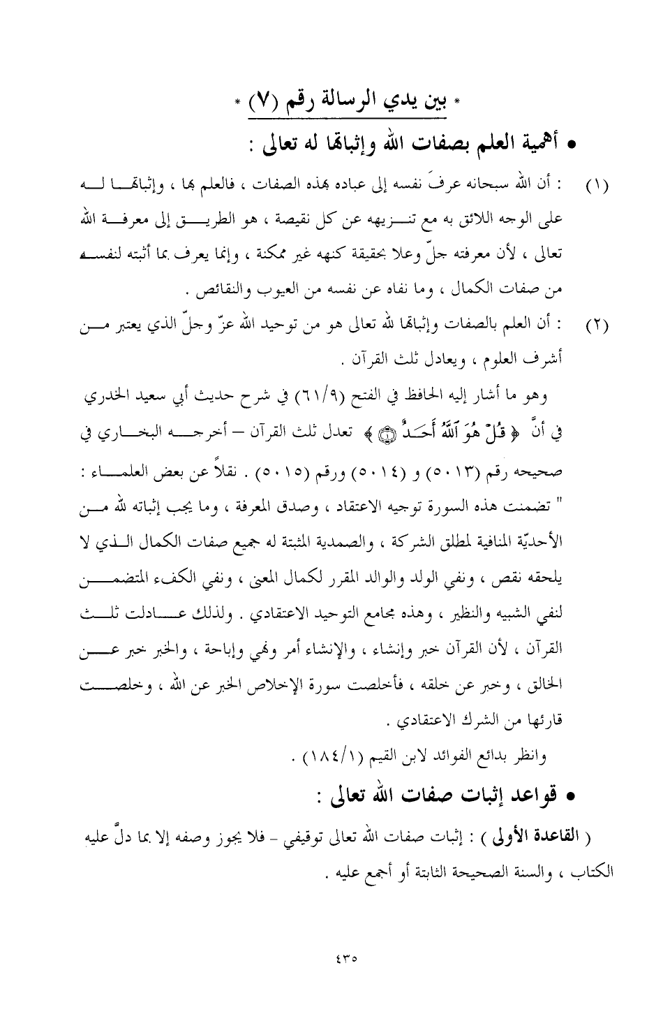 (2): أن العلم بالصفات وإثباتها لله تعالى هو من توحيد الله عز وجل الذي يعتبر من أشرف العلوم، ويعادل ثلث القرآن.
