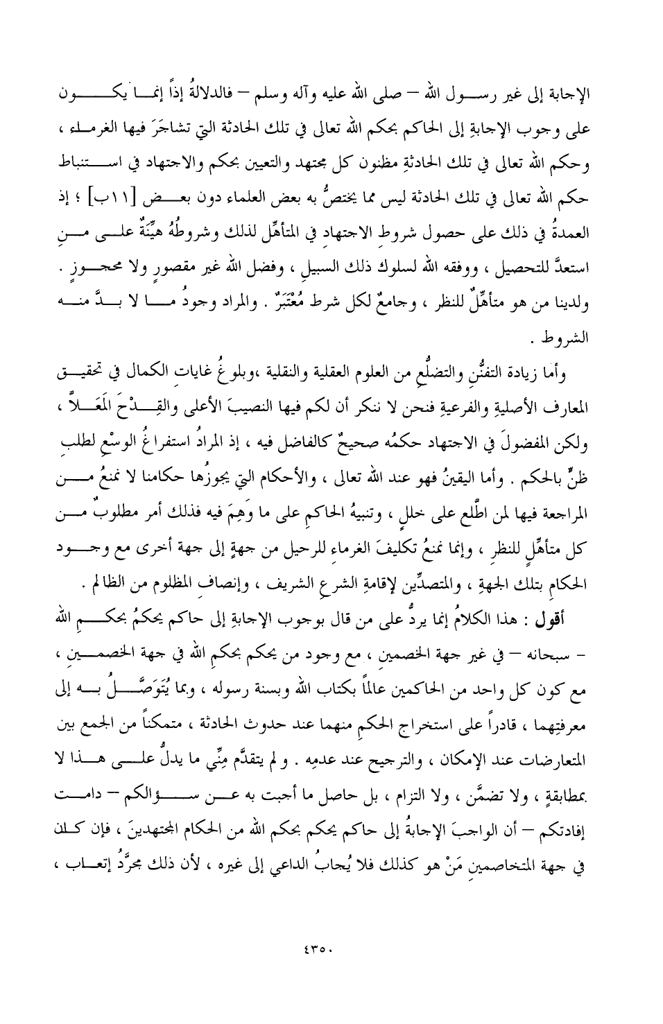 أقول: هذا الكلام إنما يرد على من قال بوجوب الإجابة إلى حاكم يحكم بحكم الله - سبحانه - في غير جهة الخصمين، مع وجود من يحكم بحكم الله في جهة الخصمين، مع كون كل واحد من الحاكمين عالمًا بكتاب الله وبسنة رسوله، وبما يتوصل به إلى معرفتهما، قادرًا على استخراج الحكم منهما عند حدوث الحادثة، متمكنًا من الجمع بين المتعارضات عند الإمكان، والترجيح عند عدمه. ولم يتقدم مني ما يدل على هذا لا بمطابقة، ولا تضمن، ولا التزام، بل حاصل ما أجبت به عن سؤالكم - دامت إفادتكم - أن الواجب الإجابة إلى حاكم يحكم بحكم الله من الحكام المجتهدين، فإن كان في جهة المتخاصمين من هو كذلك فلا يجاب الداعي إلى غيره، لأن ذلك مجرد إتعاب،