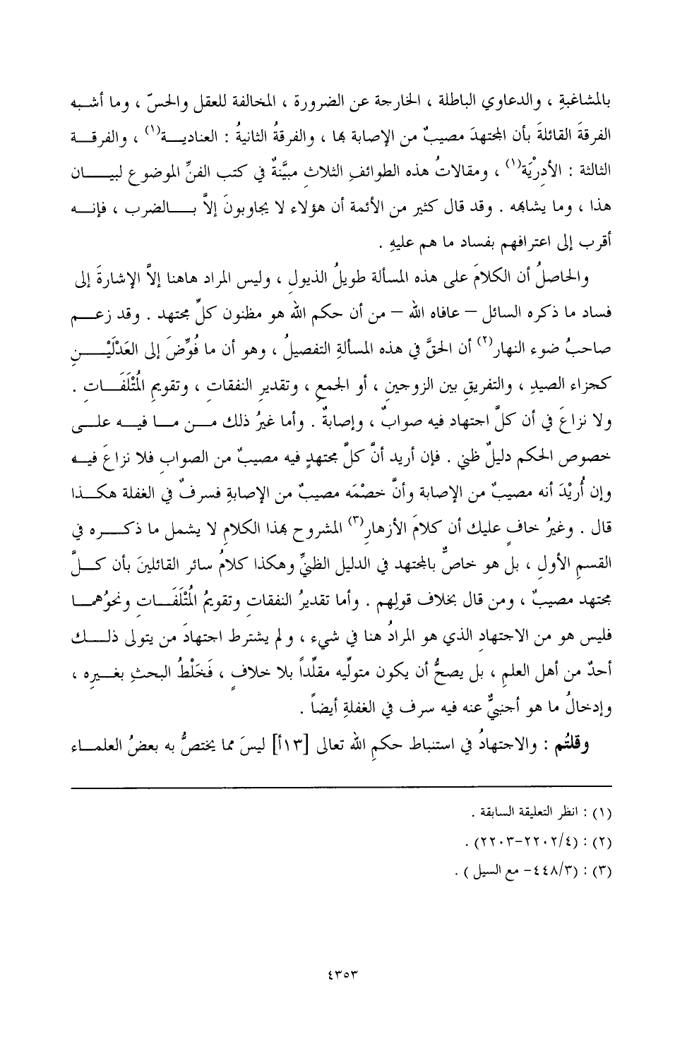 والحاصل أن الكلام على هذه المسألة طويل الذيول، وليس المراد هاهنا إلا الإشارة إلى فساد ما ذكره السائل - عافاه الله - من أن حكم الله هو مظنون كل مجتهد. وقد زعم صاحب ضوء النهار (¬3) أن الحق في هذه المسألة التفصيل، وهو أن ما فوض إلى العدلين كجزاء الصيد، والتفريق بين الزوجين، أو الجمع، وتقدير النفقات، وتقويم المتلفات. ولا نزاع في أن كل اجتهاد فيه صواب، وإصابة. وأما غير ذلك من ما فيه على خصوص الحكم دليل ظني. فإن أريد أن كل مجتهد فيه مصيب من الصواب فلا نزاع فيه، وإن أريد أنه مصيب من الإصابة وأن خصمه مصيب من الإصابة فسرف في الغفلة، هكذا قال. وغير خاف عليك أن كلام الأزهار (¬4) المشروح بهذا الكلام لا يشمل ما ذكره في القسم الأول، بل هو خاص بالمجتهد في الدليل الظني وهكذا كلام سائر القائلين بأن كل مجتهد مصيب، ومن قال بخلاف قولهم. وأما تقدير النفقات وتقويم المتلفات ونحوهما فليس هو من الاجتهاد الذي هو المراد هنا في شيء، ولم يشترط اجتهاد من يتولى ذلك أحد من أهل العلم، بل يصح أن يكون متوليه مقلدًا بلا خلاف، فخلط البحث بغيره، وإدخال ما هو أجنبي عنه فيه سرف في الغفلة أيضًا.