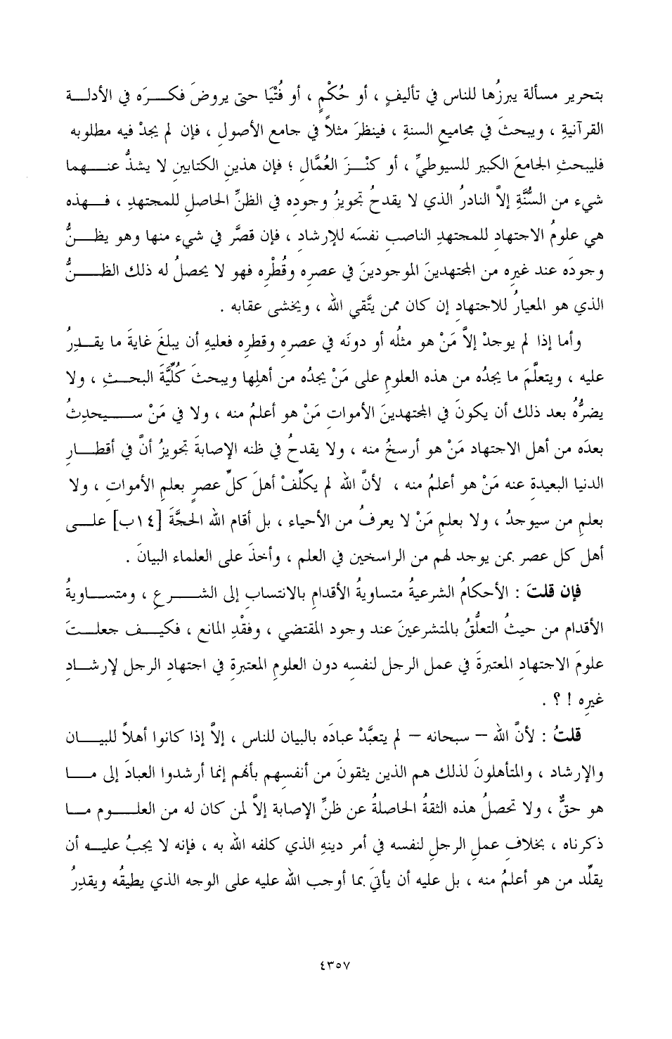 بتحرير مسألة يبرزها للناس في تأليف، أو حكم، أو فتيا حتى يروض فكره في الأدلة القرآنية، ويبحث في مجاميع السنة، فينظر مثلا في جامع الأصول، فإن لم يجد فيه مطلوبه فليبحث الجامع الكبير للسيوطي، أو كنز العمال؛ فإن هذين الكتابين لا يشذ عنهما شيء من السنة إلا النادر الذي لا يقدح تجويز وجوده في الظن الحاصل للمجتهد، فهذه هي علوم الاجتهاد للمجتهد الناصب نفسه للإرشاد، فإن قصر في شيء منها وهو يظن وجوده عند غيره من المجتهدين الموجودين في عصره وقطره فهو لا يحصل له ذلك الظن الذي هو المعيار للاجتهاد إن كان ممن يتقي الله، ويخشى عقابه.